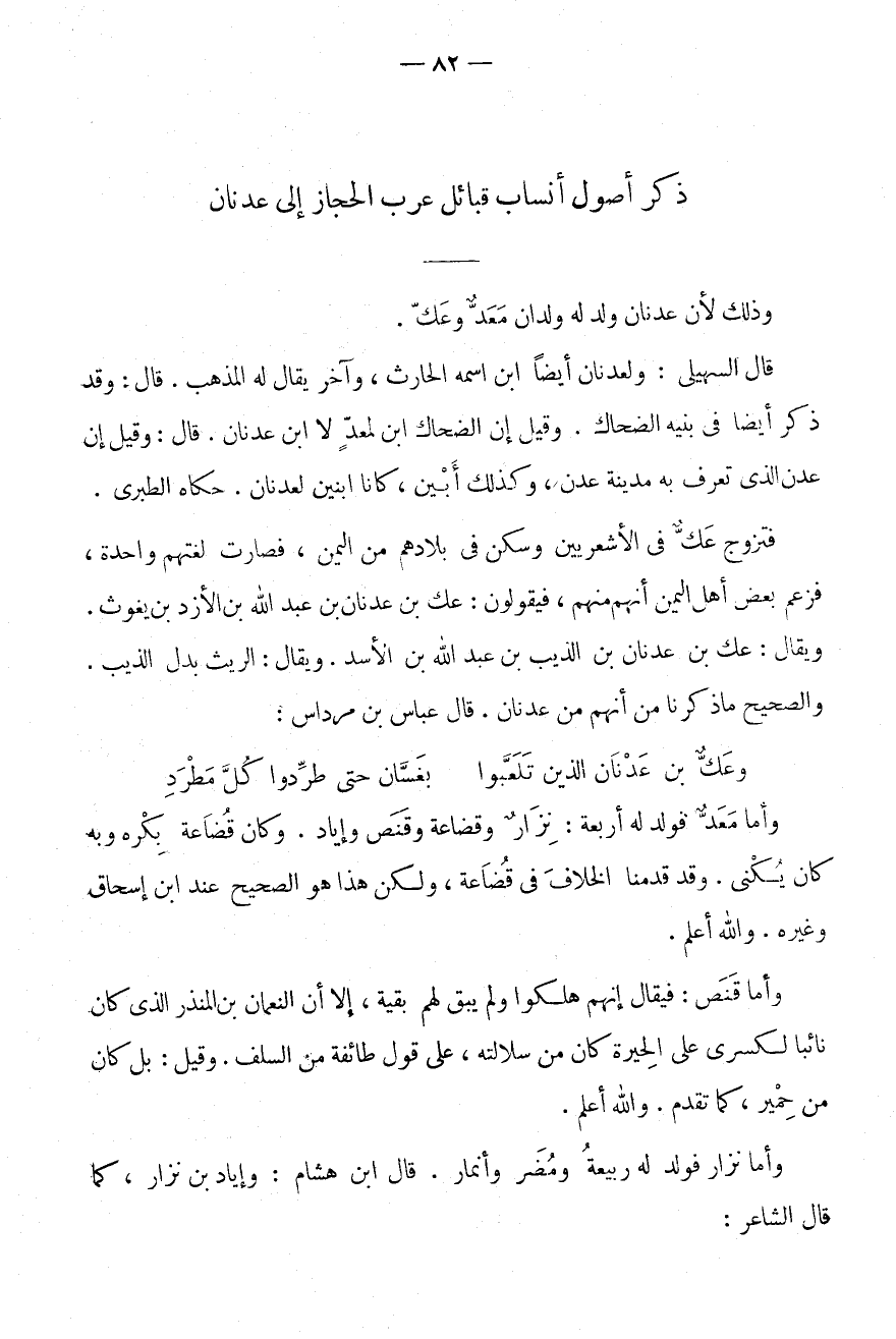 ذكر أصُول أَنْسَاب قبائل عَرَبِ الْحِجَازِ إِلَى عَدْنَانَ وَذَلِكَ لِأَنَّ عَدْنَانَ وُلِدَ لَهُ وَلَدَانِ مَعَدٌّ وَعَكٌّ.