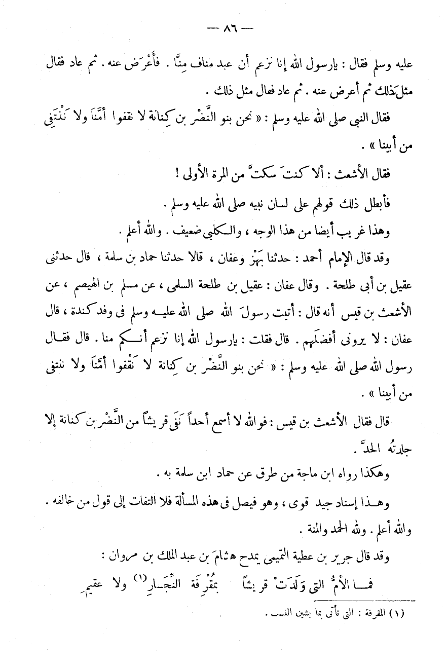 قَالَ فَقَالَ الاشعث بن قيس: فو الله لَا أَسْمَعُ أَحَدًا نَفَى قُرَيْشًا مِنَ النَّضْرِ بْنِ كِنَانَةَ إِلَّا جَلَدْتُهُ الْحَدَّ.
