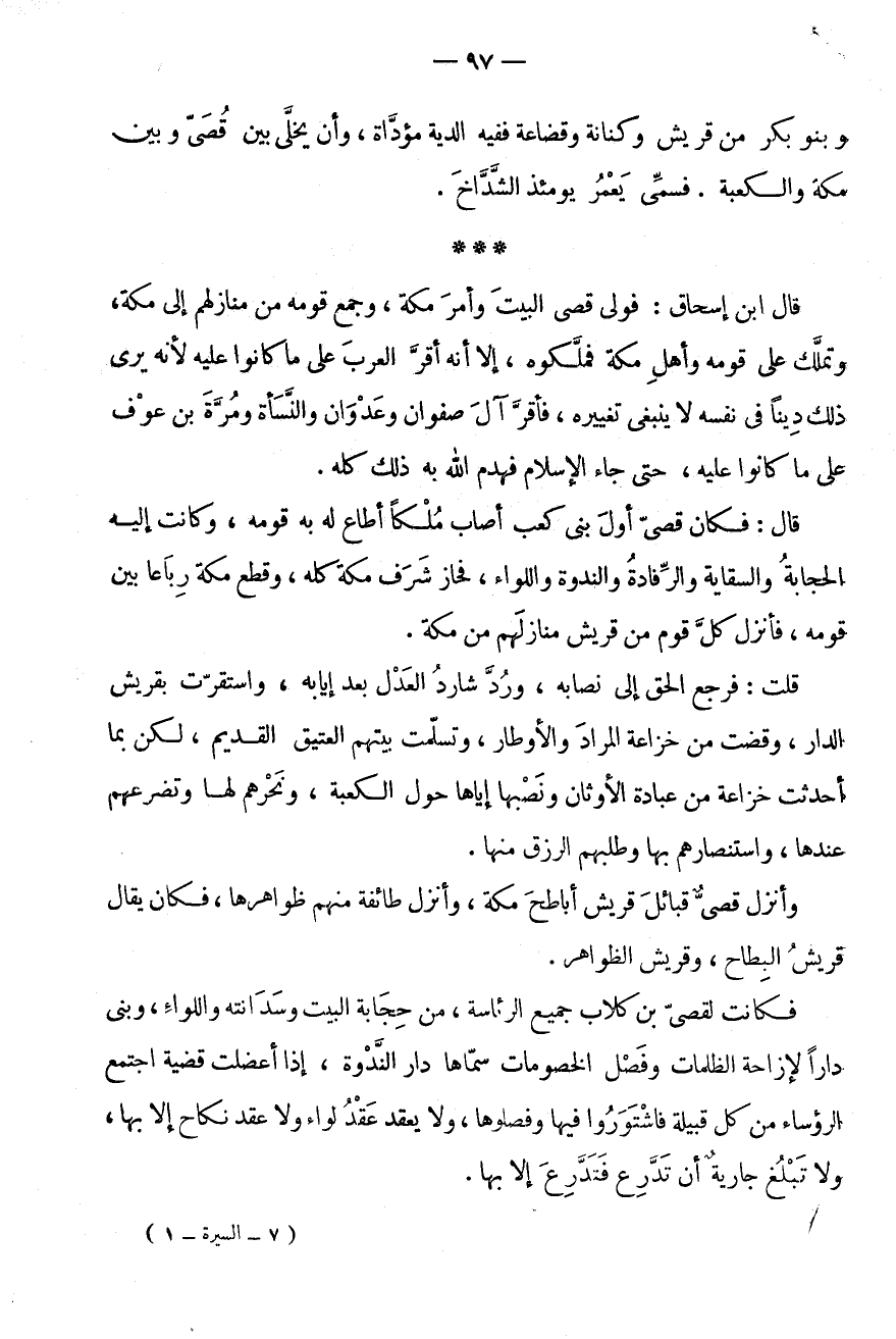 قَالَ ابْنُ إِسْحَاقَ: فَوَلِيَ قُصَيٌّ الْبَيْتَ وَأَمْرَ مَكَّةَ، وَجَمَعَ قَوْمَهُ مِنْ مَنَازِلِهِمْ إِلَى مَكَّةَ، وَتَمَلَّكَ عَلَى قَوْمِهِ وَأَهْلِ مَكَّةَ فَمَلَّكُوهُ، إِلَّا أَنَّهُ أَقَرَّ الْعَرَبَ عَلَى مَا كَانُوا عَلَيْهِ لِأَنَّهُ يَرَى ذَلِكَ دِينًا فِي نَفْسِهِ لَا يَنْبَغِي تَغْيِيرُهُ، فَأَقَرَّ آلَ صَفْوَانَ وَعَدْوَانَ وَالنَّسَأَةَ وَمُرَّةَ بْنَ عَوْفٍ عَلَى مَا كَانُوا عَلَيْهِ، حَتَّى جَاءَ الْإِسْلَامُ فَهَدَمَ اللَّهُ بِهِ ذَلِكَ كُلَّهُ.