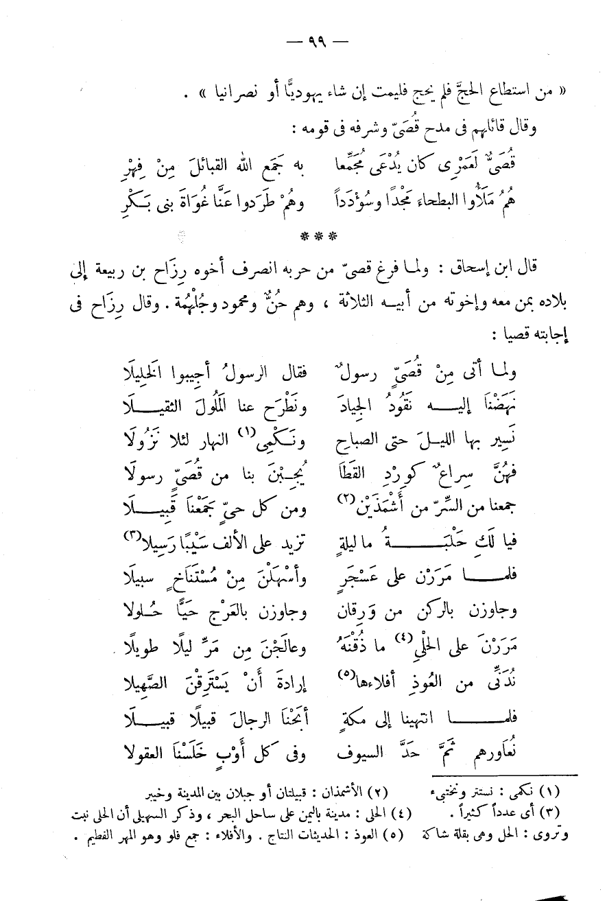 وَقَالَ قَائِلُهُمْ فِي مَدْحِ قُصَيٍّ وَشَرَفِهِ فِي قَوْمِهِ: قُصَيٌّ لَعَمْرِي كَانَ يدعى مجمعا * بِهِ جمع الله الْقَبَائِل من فهر هم ملاوا الْبَطْحَاءَ مَجْدًا وَسُؤْدَدًا * وَهُمْ طَرَدُوا عَنَّا غُوَاةَ بَنِي بَكْرٍ قَالَ ابْنُ إِسْحَاقَ: وَلَمَّا فَرَغَ قصى من حربه انْصَرف أَخُوهُ رزاح بَين رَبِيعَةَ إِلَى بِلَادِهِ بِمَنْ مَعَهُ وَإِخْوَتِهِ مِنْ أَبِيه الثَّلَاثَة، وهم حن ومحمود وجلهمة.
