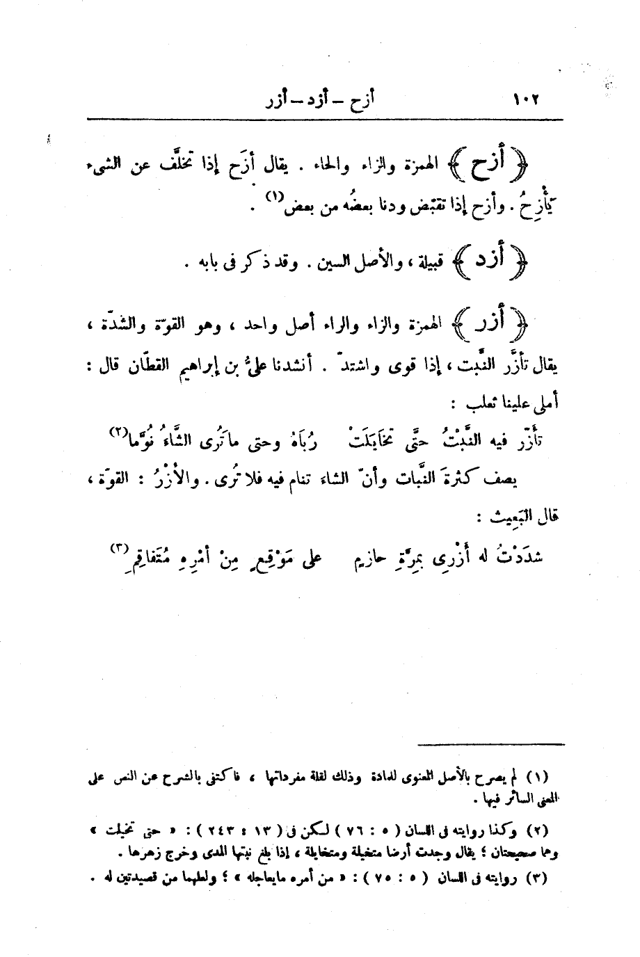 (أَزَرَ) الْهَمْزَةُ وَالزَّاءُ وَالرَّاءُ أَصْلٌ وَاحِدٌ، وَهُوَ الْقُوَّةُ وَالشِّدَّةُ، يُقَالُ: تَأَزَّرَ النَّبْتُ: إِذَا قَوِيَ وَاشْتَدَّ. أَنْشَدَنَا عَلِيُّ بْنُ إِبْرَاهِيمَ الْقَطَّانُ قَالَ: أَمْلَى عَلَيْنَا ثَعْلَبٌ: