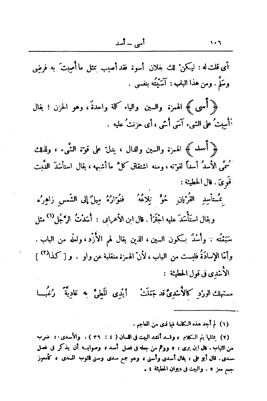 (أَسَدَ) الْهَمْزَةُ وَالسِّينُ وَالدَّالُ، يَدُلُّ عَلَى قُوَّةِ الشَّيْءِ، وَلِذَلِكَ سُمِّيَ الْأَسَدُ أَسَدًا لِقُوَّتِهِ، وَمِنْهُ اشْتِقَاقُ كُلِّ مَا أَشْبَهَهُ، يُقَالُ: اسْتَأْسَدَ النَّبْتُ قَوِيَ. قَالَ الْحُطَيْئَةُ: