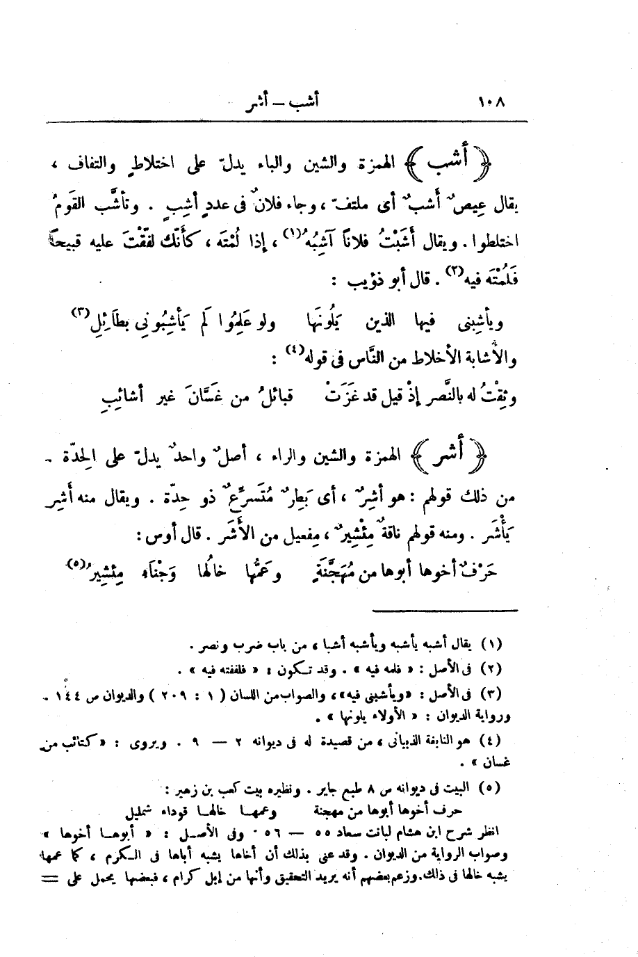(أَشَبَ) الْهَمْزَةُ وَالشِّينُ وَالْبَاءُ يَدُلُّ عَلَى اخْتِلَاطٍ وَالْتِفَافٍ، يُقَالُ: عِيصٌ أَشِبٌ، أَيْ: مُلْتَفٌّ، وَجَاءَ فُلَانٌ فِي عَدَدٍ أَشِبٍ. وَتَأَشَّبَ الْقَوْمُ اخْتَلَطُوا. وَيُقَالُ: أَشَبْتُ فُلَانًا آشِبُهُ: إِذَا لُمْتُهُ، كَأَنَّكَ لَفَّقْتَ عَلَيْهِ قَبِيحًا فَلُمْتَهُ فِيهِ. قَالَ أَبُو ذُؤَيْبٍ: