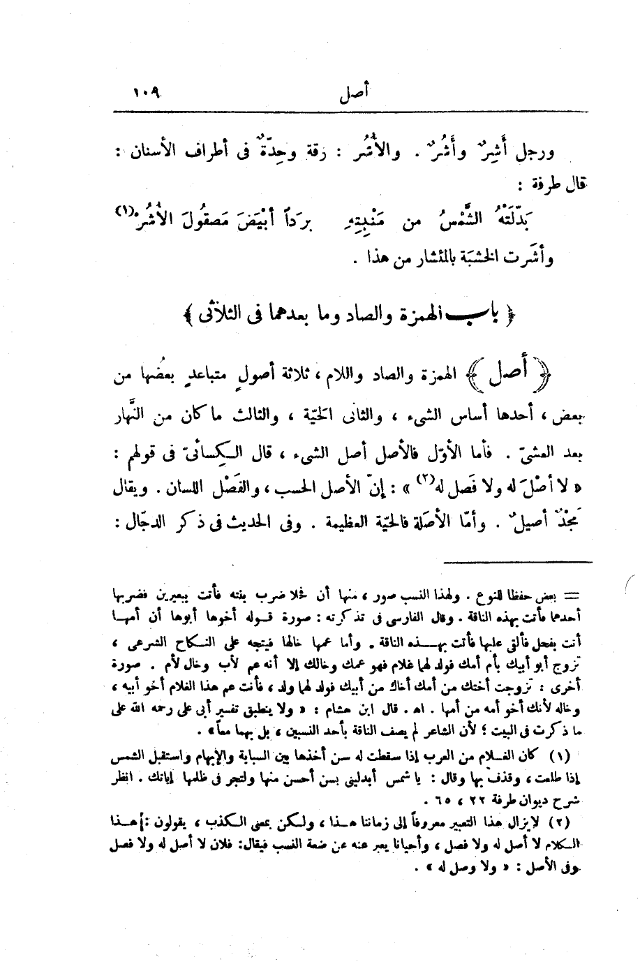 (أَصَلَ) الْهَمْزَةُ وَالصَّادُ وَاللَّامُ، ثَلَاثَةُ أُصُولٍ مُتَبَاعِدٍ بَعْضُهَا مِنْ بَعْضٍ، أَحَدُهَا: أَسَاسُ الشَّيْءِ، وَالثَّانِي: الْحَيَّةُ، وَالثَّالِثُ: مَا كَانَ مِنَ النَّهَارِ بَعْدَ الْعَشِيِّ. فَأَمَّا الْأَوَّلُ فَالْأَصْلُ أَصْلُ الشَّيْءِ، قَالَ الْكِسَائِيُّ فِي قَوْلِهِمْ: " لَا أَصْلَ لَهُ وَلَا فَصْلَ لَهُ ": إِنَّ الْأَصْلَ الْحَسَبُ، وَالْفَصْلَ اللِّسَانُ. وَيُقَالُ: مَجْدٌ أَصِيلٌ. وَأَمَّا الْأَصَلَةُ فَالْحَيَّةُ الْعَظِيمَةُ. وَفِي الْحَدِيثِ فِي ذِكْرِ الدَّجَّالِ: