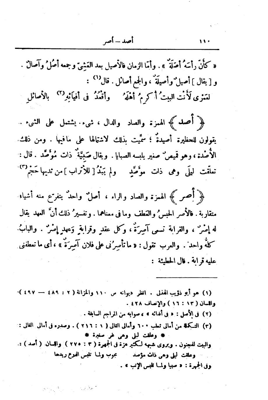 «كَأَنَّ رَأْسَهُ أَصَلَةٌ» . وَأَمَّا الزَّمَانُ فَالْأَصِيلُ بَعْدَ الْعَشِيِّ وَجَمْعُهُ أُصُلٌ وَآصَالٌ. وَ [يُقَالُ] أَصِيلٌ وَأَصِيلَةٌ، وَالْجَمْعُ أَصَائِلُ. قَالَ: