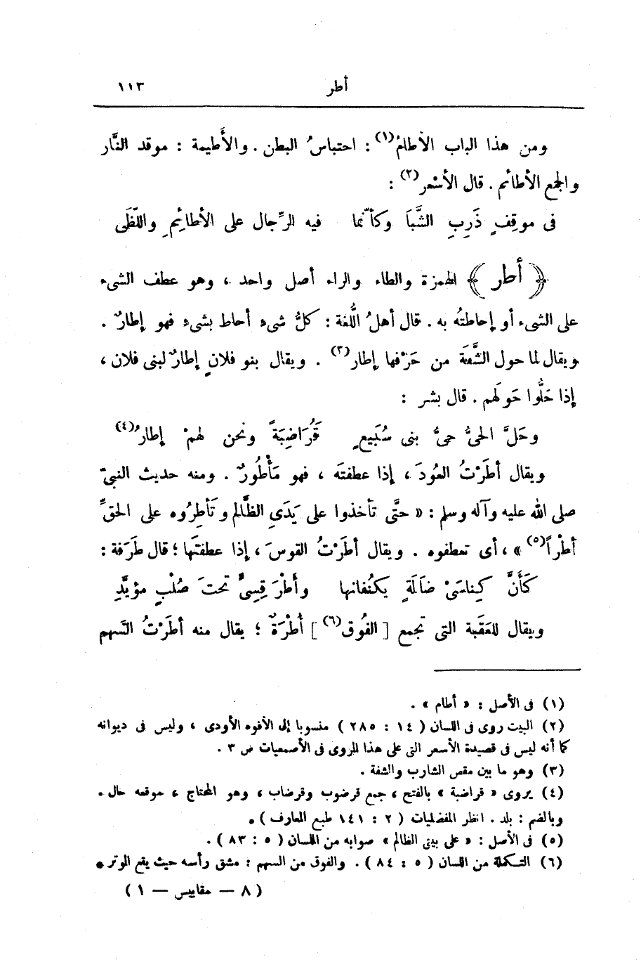 (أَطَرَ) الْهَمْزَةُ وَالطَّاءُ وَالرَّاءُ أَصْلٌ وَاحِدٌ، وَهُوَ عَطْفُ الشَّيْءِ عَلَى الشَّيْءِ أَوْ إِحَاطَتُهُ بِهِ. قَالَ أَهْلُ اللُّغَةِ: كُلُّ شَيْءٍ أَحَاطَ بِشَيْءٍ فَهُوَ إِطَارٌ. وَيُقَالُ لِمَا حَوْلَ الشَّفَةِ مِنْ حَرْفِهَا إِطَارٌ. وَيُقَالُ: بَنُو فُلَانٍ إِطَارٌ لِبَنِي فُلَانٍ: إِذَا حَلُّوا حَوْلَهُمْ. قَالَ بِشْرٌ: