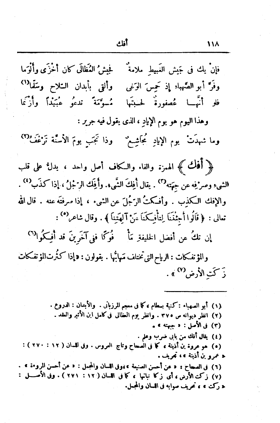 (أَفَكَ) الْهَمْزَةُ وَالْفَاءُ وَالْكَافُ أَصْلٌ وَاحِدٌ، يَدُلُّ عَلَى قَلْبِ الشَّيْءِ وَصَرْفِهِ عَنْ جِهَتِهِ. يُقَالُ: أُفِكَ الشَّيْءُ. وَأَفِكَ الرَّجُلُ: إِذَا كَذَبَ. وَالْإِفْكُ الْكَذِبُ. وَأَفَكْتُ الرَّجُلَ عَنِ الشَّيْءِ: إِذَا صَرَفْتُهُ عَنْهُ. قَالَ اللَّهُ تَعَالَى: {قَالُوا أَجِئْتَنَا لِتَأْفِكَنَا عَنْ آلِهَتِنَا} [الأحقاف: 22] . وَقَالَ شَاعِرٌ: