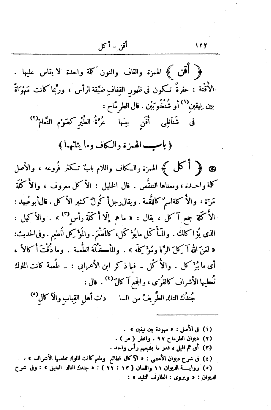 (أَكَلَ) الْهَمْزَةُ وَالْكَافُ وَاللَّامُ بَابٌ تَكْثُرُ فُرُوعُهُ، وَالْأَصْلُ كَلِمَةٌ وَاحِدَةٌ، وَمَعْنَاهَا التَّنَقُّصُ. قَالَ الْخَلِيلُ: الْأَكْلُ مَعْرُوفٌ وَالْأَكْلَةُ مَرَّةٌ، وَالْأُكَلَةُ اسْمٌ كَاللُّقْمَةِ. وَيُقَالُ: رَجُلٌ أَكُولٌ كَثِيرُ الْأَكْلِ. قَالَ أَبُو عُبَيْدٍ: الْأَكَلَةُ جَمْعُ آكِلٍ، يُقَالُ: " مَا هُمْ إِلَّا أَكَلَةُ رَأْسٍ ". وَالْأَكِيلُ: الَّذِي يُؤَاكِلُكَ. وَالْمَأْكَلُ مَا يُؤْكَلُ، كَالْمَطْعَمِ. وَالْمُؤْكِلُ الْمُطْعِمُ. وَفِي الْحَدِيثِ: «لَعَنَ اللَّهُ آكِلَ الرِّبَا وَمُؤْكِلَهُ» . وَالْمَأْكَلَةُ الطُّعْمَةُ. وَمَا ذُقْتُ أَكَالًا، أَيْ: مَا يُؤْكَلُ. وَالْأُكْلُ - فِيمَا ذَكَرَ ابْنُ الْأَعْرَابِيِّ -: طُعْمَةٌ كَانَتِ الْمُلُوكُ تُعْطِيهَا الْأَشْرَافَ كَالْقُرَى، وَالْجَمْعُ آكَالٌ. قَالَ: