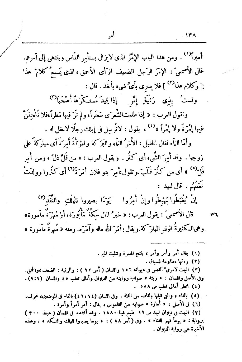 وَأَمَّا النَّمَاءُ فَقَالَ الْخَلِيلُ: الْأَمَرُ النَّمَاءُ وَالْبَرَكَةُ وَامْرَأَةٌ أَمِرَةٌ، أَيْ: مُبَارَكَةٌ عَلَى زَوْجِهَا. وَقَدْ أَمِرَ الشَّيْءُ أَيْ كَثُرَ. وَتَقُولُ الْعَرَبُ: " مَنْ قَلَّ ذَلَّ، وَمَنْ أَمِرَ فَلَّ "، أَيْ: مَنْ كَثُرَ غَلَبَ. وَتَقُولُ: أَمِرَ بَنُو فُلَانٍ أَمَرَةً، أَيْ: كَثُرُوا وَوَلَدَتْ نَعَمُهُمْ. قَالَ لَبِيدٌ: