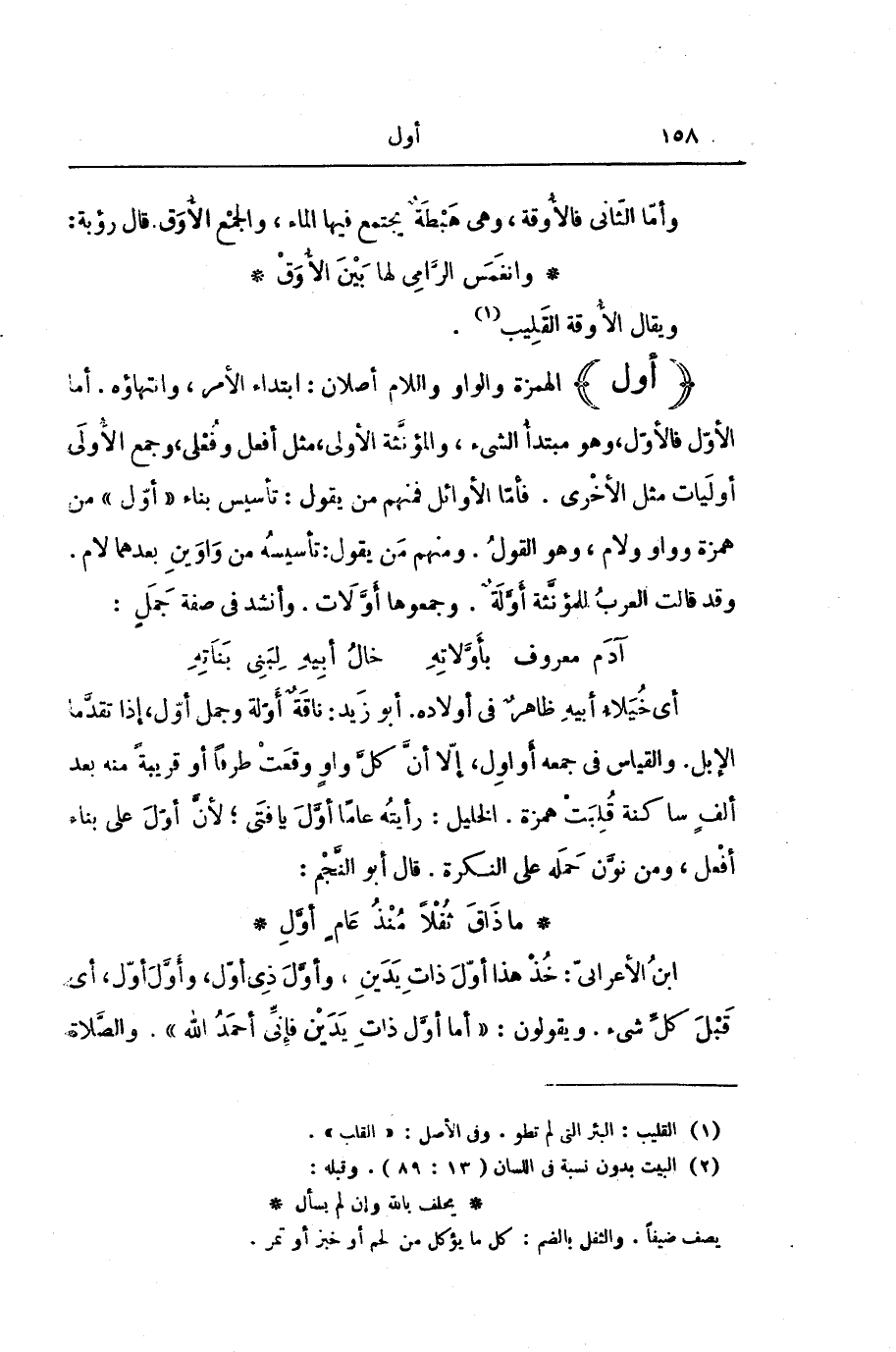أَيْ: خُيَلَاءُ أَبِيهِ ظَاهِرٌ فِي أَوْلَادِهِ. أَبُو زَيْدٍ: نَاقَةٌ أَوَّلَةٌ وَجَمَلٌ أَوَّلٌ: إِذَا تَقَدَّمَا الْإِبِلَ. وَالْقِيَاسُ فِي جَمْعِهِ أَوَاوِلُ، إِلَّا أَنَّ كُلَّ وَاوٍ وَقَعَتْ طَرَفًا أَوْ قَرِيبَةً مِنْهُ بَعْدَ أَلِفٍ سَاكِنَةٍ قُلِبَتْ هَمْزَةً. الْخَلِيلُ: رَأَيْتُهُ عَامًا أَوَّلَ يَا فَتَى، لِأَنَّ أَوَّلَ عَلَى بِنَاءِ أَفْعَلَ، وَمَنْ نَوَّنَ حَمَلَهُ عَلَى النَّكِرَةِ. قَالَ أَبُو النَّجْمِ: