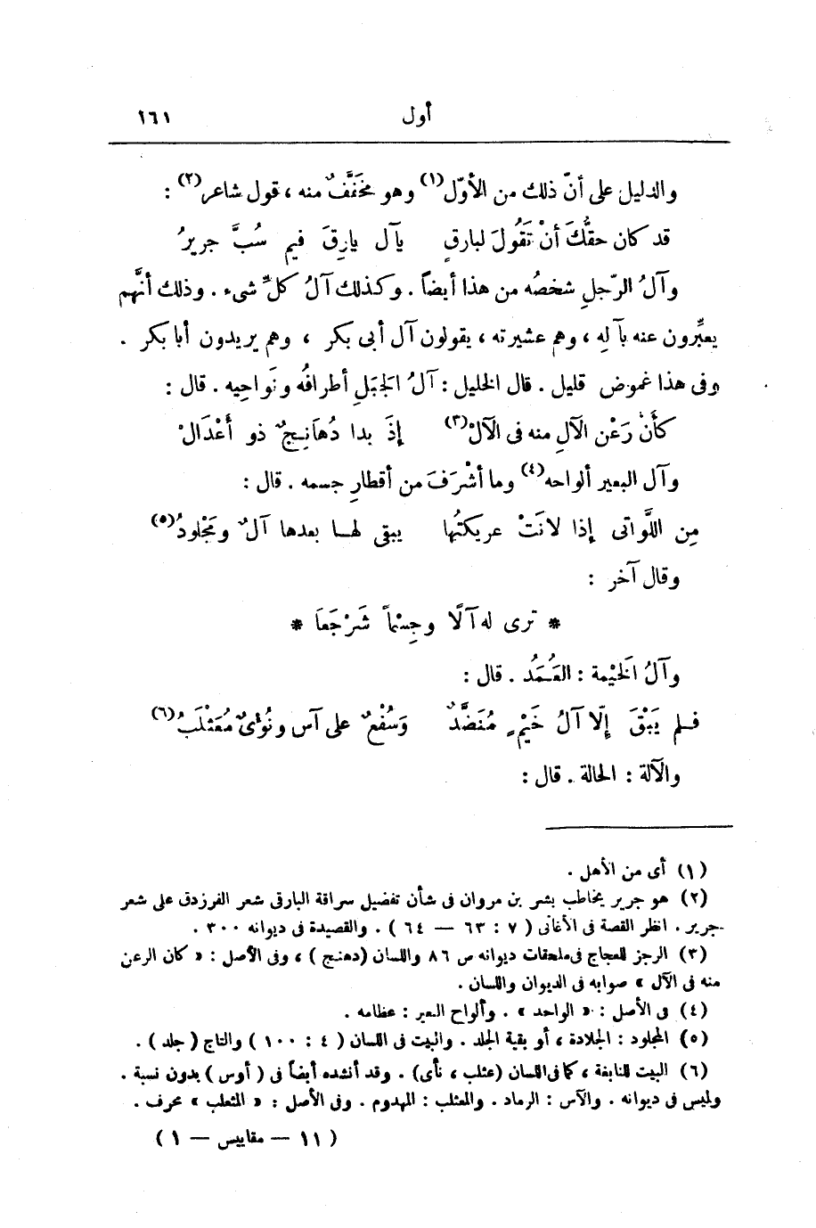 وَآلُ الرَّجُلِ شَخْصُهُ مِنْ هَذَا أَيْضًا. وَكَذَلِكَ آلُ كُلِّ شَيْءٍ. وَذَلِكَ أَنَّهُمْ يُعَبِّرُونَ عَنْهُ بِآلِهِ، وَهُمْ عَشِيرَتُهُ، يَقُولُونَ آلُ أَبِي بَكْرٍ، وَهُمْ يُرِيدُونَ أَبَا بَكْرٍ. وَفِي هَذَا غُمُوضٌ قَلِيلٌ. قَالَ الْخَلِيلُ: آلُ الْجَبَلِ أَطْرَافُهُ وَنَوَاحِيهِ. قَالَ: