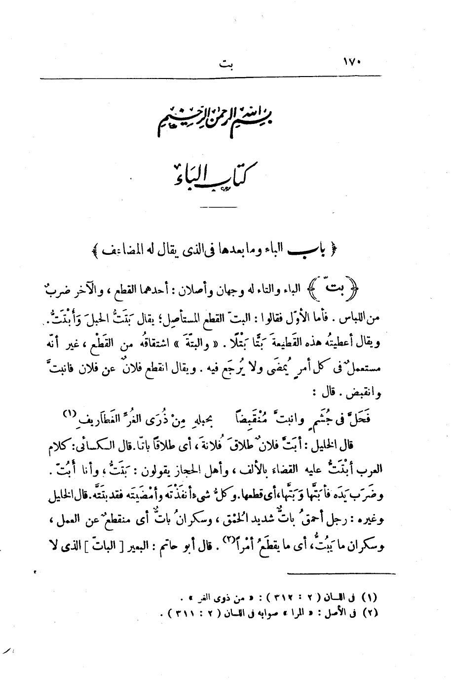 قَالَ الْخَلِيلُ: أَبَتَّ فُلَانٌ طَلَاقَ فُلَانَةَ، أَيْ: طَلَاقًا بَاتًّا. قَالَ الْكِسَائِيُّ: كَلَامُ الْعَرَبِ أَبْتَتُّ عَلَيْهِ الْقَضَاءَ بِالْأَلِفِ، وَأَهْلُ الْحِجَازِ يَقُولُونَ: بَتَتُّ، وَأَنَا أَبُتُّ. وَضَرَبَ يَدَهُ فَأَبَتَّهَا وَبَتَّهَا، أَيْ: قَطَعَهَا. وَكُلُّ شَيْءٍ أنفَذْتَهُ وَأَمْضَيْتَهُ فَقَدْ بَتَتَّهُ. قَالَ الْخَلِيلُ وَغَيْرُهُ: رَجُلٌ أَحْمَقُ بَاتٌّ شَدِيدُ الْحُمْقِ، وَسَكْرَانُ بَاتٌّ، أَيْ: مُنْقَطِعٌ عَنِ الْعَمَلِ، وَسَكْرَانُ مَا يَبُتُّ، أَيْ: مَا يَقْطَعُ أمْرًا. قَالَ أَبُو حَاتِمٍ: الْبَعِيرُ [الْبَاتُّ] الَّذِي لَا