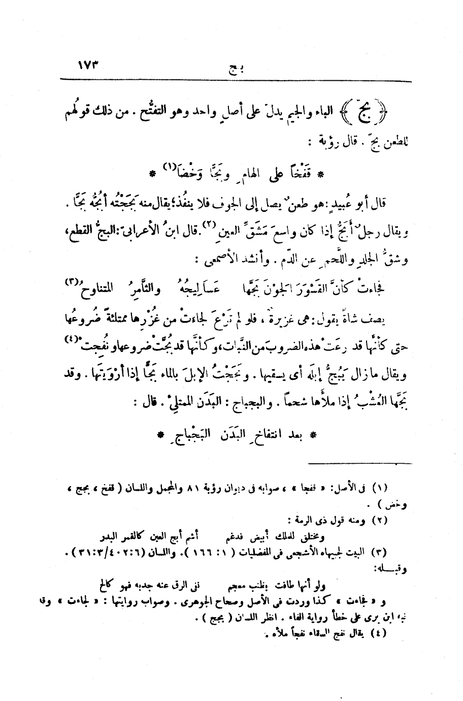 (بَجَّ) الْبَاءُ وَالْجِيمُ يَدُلُّ عَلَى أَصْلٍ وَاحِدٍ وَهُوَ التَّفَتُّحُ. مِنْ ذَلِكَ قَوْلُهُمْ لِلطَّعْنِ بَجَّ. قَالَ رُؤْبَةُ: