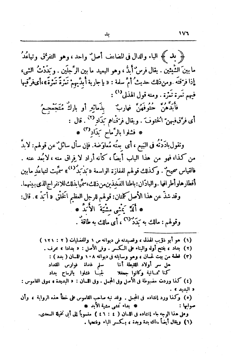 وَتَقُولُ بَادَدْتُهُ فِي الْبَيْعِ، أَيْ: بِعْتُهُ مُعَاوَضَةً. فَإِنْ سَأَلَ سَائِلٌ عَنْ قَوْلِهِمْ: لَا بُدَّ مِنْ كَذَا، فَهُوَ مِنْ هَذَا الْبَابِ أَيْضًا، كَأَنَّهُ أَرَادَ لَا فِرَاقَ مِنْهُ، لَا بُعْدَ عَنْهُ. فَالْقِيَاسُ صَحِيحٌ. وَكَذَلِكَ قَوْلُهُمْ لِلْمَفَازَةِ الْوَاسِعَةِ " بَدْبَدٌ " سُمِّيَتْ لِتَبَاعُدِ مَا بَيْنَ أَقْطَارِهَا وَأَطْرَافِهَا. وَالْبَادَّانِ: بَاطِنَا الْفَخِذَيْنِ مِنْ ذَلِكَ، سُمِّيَا بِذَلِكَ لِلِانْفِرَاجِ الَّذِي بَيْنَهُمَا. وَقَدْ شَذَّ عَنْ هَذَا الْأَصْلِ كَلِمَتَانِ: قَوْلُهُمْ لِلرَّجُلِ الْعَظِيمِ الْخَلْقِ " أَبَدُّ ". قَالَ:
