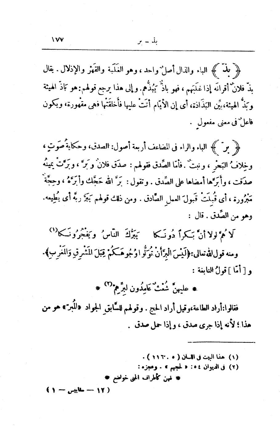 وَمِنْهُ قَوْلُ اللَّهِ تَعَالَى: {لَيْسَ الْبِرَّ أَنْ تُوَلُّوا وُجُوهَكُمْ قِبَلَ الْمَشْرِقِ وَالْمَغْرِبِ} [البقرة: 177] . وَ [أَمَّا] قَوْلُ النَّابِغَةِ: