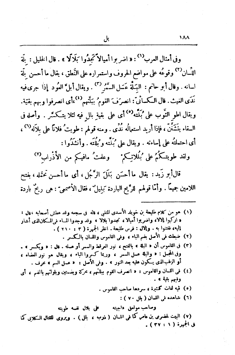 وَفِي أَمْثَالِ الْعَرَبِ: " اضْرِبُوا أَمْيَالًا تَجِدُوا بَلَالًا ". قَالَ الْخَلِيلُ: بِلَّةُ اللِّسَانِ وُقُوعُهُ عَلَى مَوَاضِعِ الْحُرُوفِ وَاسْتِمْرَارُهُ عَلَى النُّطْقِ، يُقَالُ: مَا أَحْسَنَ بِلَّةَ لِسَانِهِ. وَقَالَ أَبُو زَيْدٍ: الْبَِلَّةُ عَسَلُ السَّمُرِ. وَيُقَالُ: أَبَلَّ الْعُودُ: إِذَا جَرَى فِيهِ نَدَى الْغَيْثِ. قَالَ الْكِسَائِيُّ: انْصَرَفَ الْقَوْمُ بِبَلَّتِهِمْ، أَيِ انْصَرَفُوا وَبِهِمْ بَقِيَّةٌ. وَيُقَالُ: اطْوِ الثَّوْبَ عَلَى بَُلَّتِهِ، أَيْ: عَلَى بَقِيَّةِ بَلَلٍ فِيهِ لِئَلَّا يَتَكَسَّرَ. وَأَصْلُهُ فِي السِّقَاءِ يَتَشَنَّنُ، فَإِذَا أُرِيدَ اسْتِعْمَالُهُ نُدِّيَ. وَمِنْهُ قَوْلُهُمْ: طَوَيْتُ فُلَانًا عَلَى بِلَالِهِ، أَيِ احْتَمَلْتُهُ عَلَى إِسَاءَتِهِ، وَيُقَالُ: عَلَى بُلَّتِهِ وَبُلُلَتِهِ. وَأَنْشَدُوا: