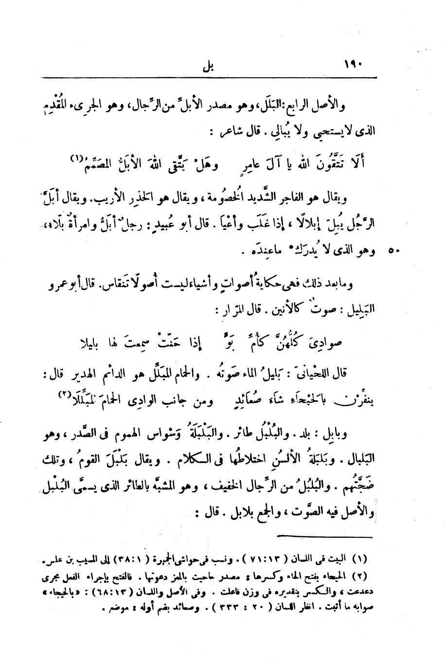 وَالْأَصْلُ الرَّابِعُ: الْبَلَلُ، وَهُوَ مَصْدَرُ الْأَبَلِّ مِنَ الرِّجَالِ، وَهُوَ الْجَرِيءُ الْمُقْدِمُ الَّذِي لَا يَسْتَحْيِي وَلَا يُبَالِي. قَالَ شَاعِرٌ: