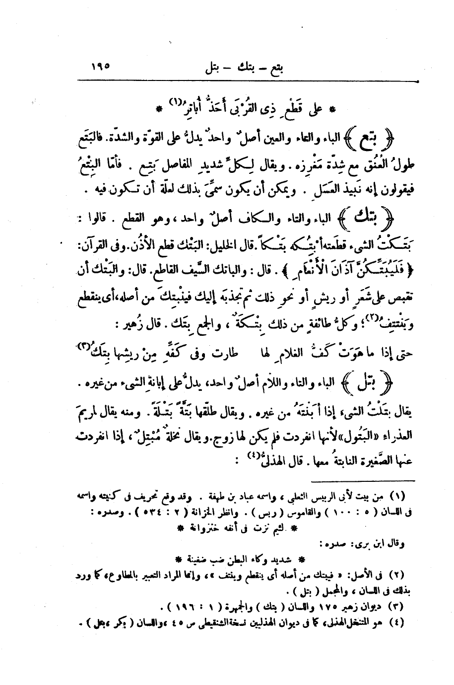 (بَتَكَ) الْبَاءُ وَالتَّاءُ وَالْكَافُ أَصْلٌ وَاحِدٌ، وَهُوَ الْقَطْعُ. قَالُوا: بَتَكْتُ الشَّيْءَ قَطَعْتُهُ أَبْتُِكُهُ بَتْكًا. قَالَ الْخَلِيلُ: الْبَتْكُ قَطْعُ الْأُذُنِ. وَفِي الْقُرْآنِ: {فَلَيُبَتِّكُنَّ آذَانَ الْأَنْعَامِ} [النساء: 119] . قَالَ: وَالْبَاتِكُ السَّيْفُ الْقَاطِعُ. قَالَ: وَالْبَتْكُ أَنْ تَقْبِضَ عَلَى شَعَرٍ أَوْ رِيشٍ أَوْ نَحْوِ ذَلِكَ ثُمَّ تَجْذِبَهُ إِلَيْكَ فَيَنْبَتِكَ مِنْ أَصْلِهِ، أَيْ: يَنْقَطِعَ وَيَنْتَتِفَ، وَكُلُّ طَائِفَةٍ مِنْ ذَلِكَ بِتْكَةٌ، وَالْجَمْعُ بِتَكٌ. قَالَ زُهَيْرٌ: