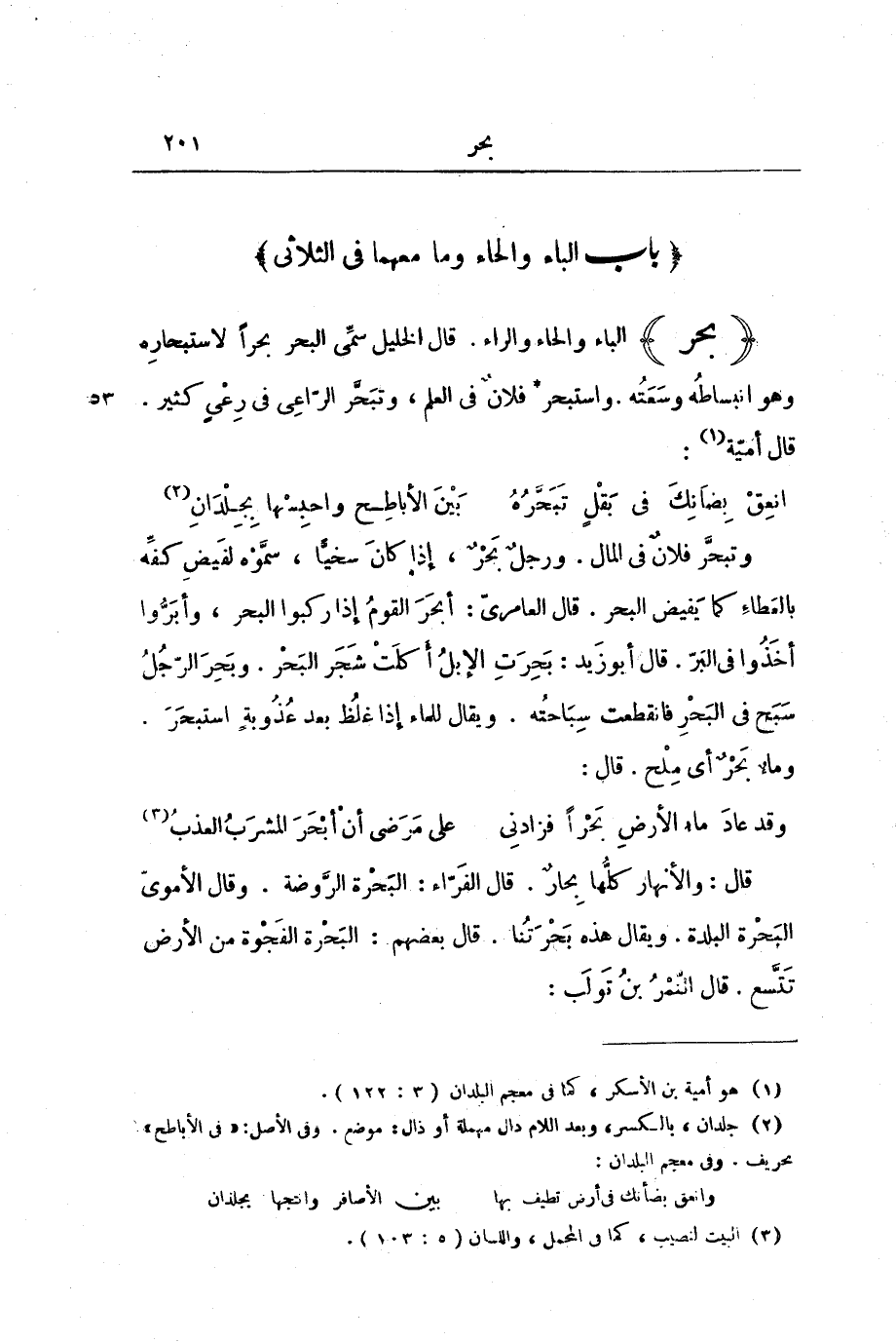 (بَحَرَ) الْبَاءُ وَالْحَاءُ وَالرَّاءُ. قَالَ الْخَلِيلُ سُمِّيَ الْبَحْرُ بَحْرًا لِاسْتِبْحَارِهِ وَهُوَ انْبِسَاطُهُ وَسَعَتُهُ. وَاسْتَبْحَرَ فُلَانٌ فِي الْعِلْمِ، وَتَبَحَّرَ الرَّاعِي فِي رِعْيٍ كَثِيرٍ. قَالَ أُمَيَّةُ: