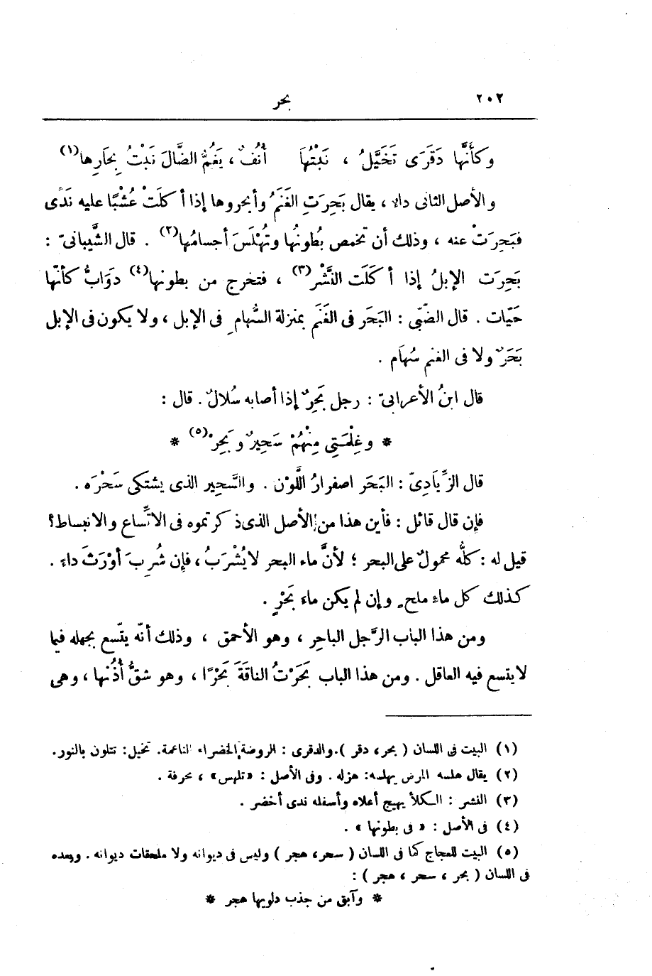 وَالْأَصْلُ الثَّانِي دَاءٌ، يُقَالُ: بَحِرَتِ الْغَنَمُ وَأَبْحَرُوهَا: إِذَا أَكَلَتْ عُشْبًا عَلَيْهِ نَدًى فَبَحِرَتْ عَنْهُ، وَذَلِكَ أَنْ تَخْمُصَ بُطُونُهَا وَتُهْلَسَ أَجْسَامُهَا. قَالَ الشَّيْبَانِيُّ: بَحِرَتِ الْإِبِلُ: إِذَا أَكَلَتِ النَّشْرَ، فَتَخْرُجُ مِنْ بُطُونِهَا دَوَابٌّ كَأَنَّهَا حَيَّاتٌ. قَالَ الضَّبِّيُّ: الْبَحَرُ فِي الْغَنَمِ بِمَنْزِلَةِ السُّهَامِ فِي الْإِبِلِ، وَلَا يَكُونُ فِي الْإِبِلِ بَحَرٌ وَلَا فِي الْغَنَمِ سُهَامٌ.