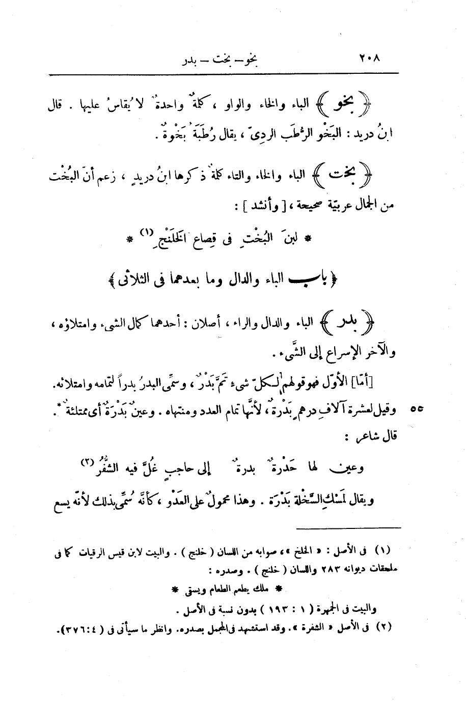 (بَدَرَ) الْبَاءُ وَالدَّالُ وَالرَّاءُ، أَصْلَانِ: أَحَدُهُمَا كَمَالُ الشَّيْءِ وَامْتِلَاؤُهُ، وَالْآخَرُ الْإِسْرَاعُ إِلَى الشَّيْءِ. [أَمَّا] الْأَوَّلُ فَهُوَ قَوْلُهُمْ لِكُلِّ شَيْءٍ تَمَّ بَدْرٌ، وَسُمِّيَ الْبَدْرُ بَدْرًا لِتَمَامِهِ وَامْتِلَائِهِ. وَقِيلَ لِعَشَرَةِ آلَافِ دِرْهَمٍ بَدْرَةٌ، لِأَنَّهَا تَمَامُ الْعَدَدِ وَمُنْتَهَاهُ. وَعَيْنٌ بَدْرَةٌ، أَيْ: مُمْتَلِئَةٌ. قَالَ شَاعِرٌ: