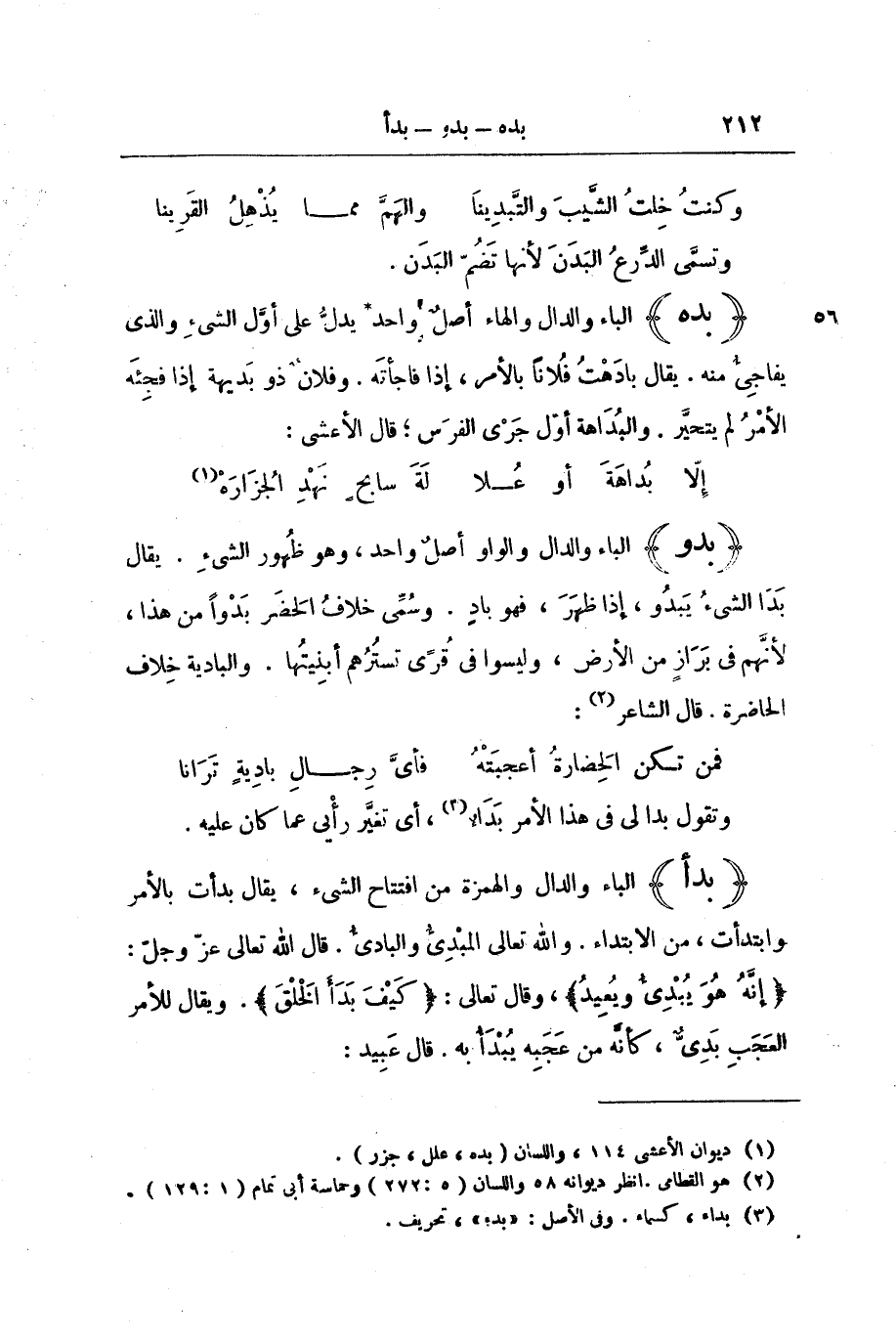 (بَدَأَ) الْبَاءُ وَالدَّالُ وَالْهَمْزَةُ مِنِ افْتِتَاحِ الشَّيْءِ، يُقَالُ: بَدَأْتُ بِالْأَمْرِ وَابْتَدَأْتُ، مِنَ الِابْتِدَاءِ. وَاللَّهُ تَعَالَى الْمُبْدِئُ وَالْبَادِئُ. قَالَ اللَّهُ عَزَّ وَجَلَّ: {إِنَّهُ هُوَ يُبْدِئُ وَيُعِيدُ} [البروج: 13] ، وَقَالَ تَعَالَى: {كَيْفَ بَدَأَ الْخَلْقَ} [العنكبوت: 20] . وَيُقَالُ: لِلْأَمْرِ الْعَجَبِ بَدِيٌّ، كَأَنَّهُ مِنْ عَجَبِهِ يُبْدَأُ بِهِ. قَالَ عَبِيدٌ: