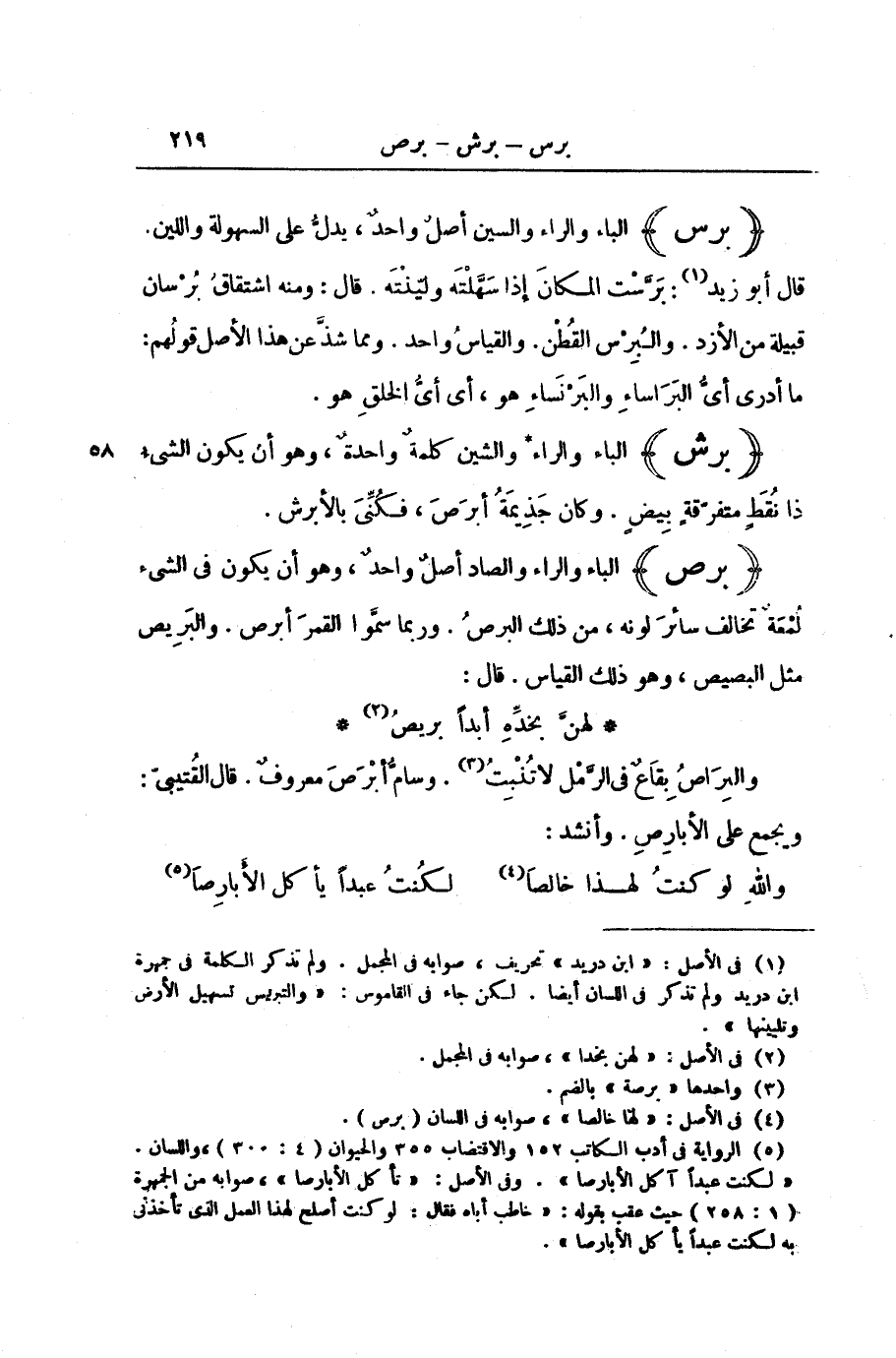 (بَرَصَ) الْبَاءُ وَالرَّاءُ وَالصَّادُ أَصْلٌ وَاحِدٌ، وَهُوَ أَنْ يَكُونَ فِي الشَّيْءِ لُمْعَةٌ تُخَالِفُ سَائِرَ لَوْنِهِ، مِنْ ذَلِكَ الْبَرَصُ. وَرُبَّمَا سَمَّوُا الْقَمَرَ أَبْرَصَ. وَالْبَرِيصُ مِثْلُ الْبَصِيصِ، وَهُوَ ذَلِكَ الْقِيَاسُ. قَالَ: