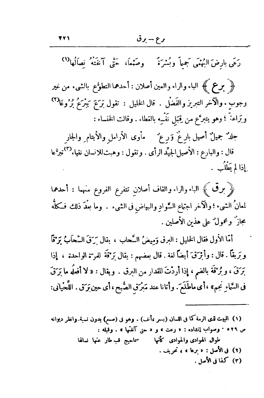 أَمَّا الْأَوَّلُ فَقَالَ الْخَلِيلُ: الْبَرْقُ وَمِيضُ السَّحَابِ، يُقَالُ: بَرَقَ السَّحَابُ بَرْقًا وَبَرِيقًا. قَالَ: وَأَبْرَقَ أَيْضًا لُغَةٌ. قَالَ بَعْضُهُمْ: يُقَالُ: بَرْقَةٌ لِلْمَرَّةِ الْوَاحِدَةِ: إِذَا بَرَقَ، وَبُرْقَةٌ بِالضَّمِّ: إِذَا أَرَدْتَ الْمِقْدَارَ مِنَ الْبَرْقِ. وَيُقَالُ: " لَا أَفْعَلُهُ مَا بَرَقَ فِي السَّمَاءِ نَجْمٌ " أَيْ: مَا طَلَعَ. وَأَتَانَا عِنْدَ مَبْرَقِ الصُّبْحِ، أَيْ: حِينَ بَرَقَ. اللِّحْيَانِيُّ: