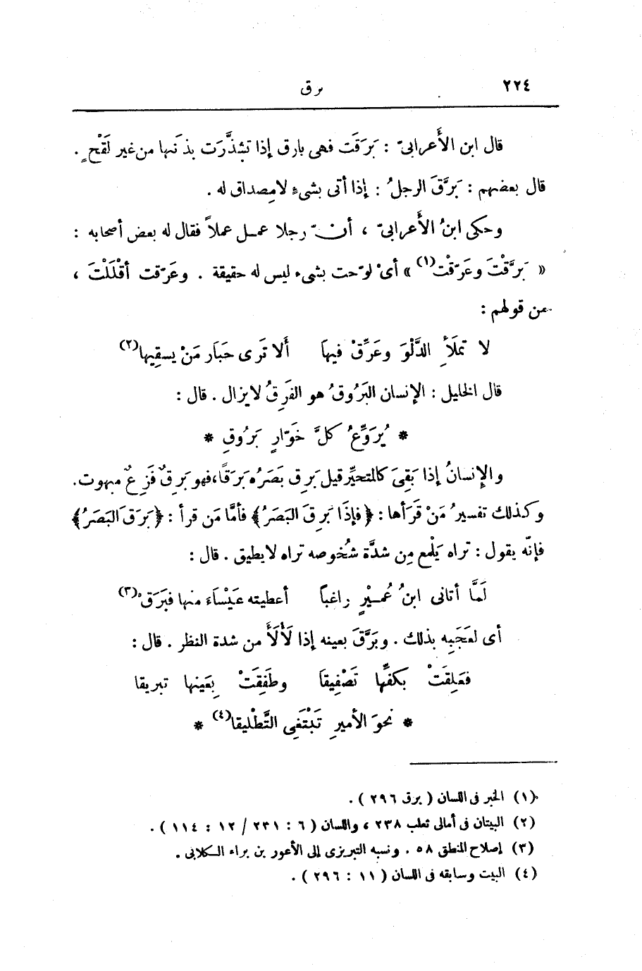وَالْإِنْسَانُ إِذَا بَقِيَ كَالْمُتَحَيِّرِ قِيلَ بَرِقَ بَصَرُهُ بَرَقًا، فَهُوَ بَرِقٌ فَزِعٌ مَبْهُوتٌ. وَكَذَلِكَ تَفْسِيرُ مَنْ قَرَأَهَا: {فَإِذَا بَرِقَ الْبَصَرُ} [القيامة: 7] ، فَأَمَّا مَنْ قَرَأَ: {بَرِقَ الْبَصَرُ} [القيامة: 7] فَإِنَّهُ يَقُولُ: تَرَاهُ يَلْمَعُ مِنْ شِدَّةِ شُخُوصِهِ تَرَاهُ لَا يُطِيقُ. قَالَ: