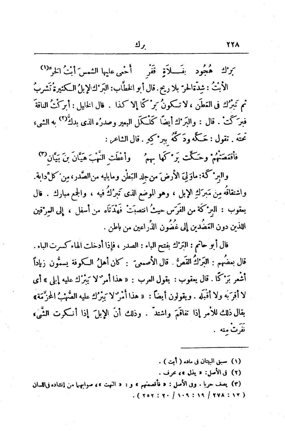 الْأَبْتُ: شِدَّةُ الْحَرِّ بِلَا رِيحٍ. قَالَ أَبُو الْخَطَّابِ: الْبَرْكُ الْإِبِلُ الْكَثِيرَةُ تَشْرَبُ ثُمَّ تَبْرُكُ فِي الْعَطَنِ، لَا تَكُونُ بَرْكًا إِلَّا كَذَا. قَالَ الْخَلِيلُ: أَبْرَكْتُ النَّاقَةَ فَبَرَكَتْ. قَالَ: وَالْبَرْكُ أَيْضًا كَلْكَلُ الْبَعِيرِ وَصَدْرُهُ الَّذِي يَدُكُّ بِهِ الشَّيْءَ تَحْتَهُ. تَقُولُ: حَكَّهُ وَدَكَّهُ بِبَرْكِهِ. قَالَ الشَّاعِرُ: