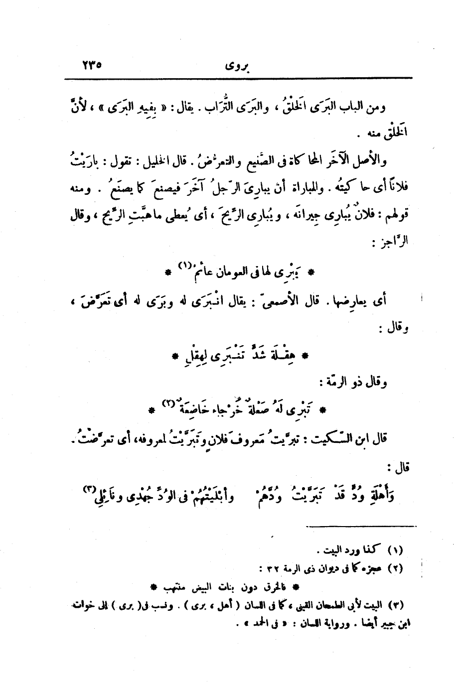 وَالْأَصْلُ الْآخَرُ الْمُحَاكَاةُ فِي الصَّنِيعِ وَالتَّعَرُّضُ. قَالَ الْخَلِيلُ: تَقُولُ: بَارَيْتُ فُلَانًا، أَيْ: حَاكَيتَهُ. وَالْمُبَارَاةُ أَنْ يُبَارِيَ الرَّجُلُ آخَرَ فَيَصْنَعَ كَمَا يَصْنَعُ. وَمِنْهُ قَوْلُهُمْ: فُلَانٌ يُبَارِي جِيرَانَهُ، وَيُبَارِي الرِّيحَ، أَيْ: يُعْطِي مَا هَبَّتِ الرِّيحُ، وَقَالَ الرَّاجِزُ: