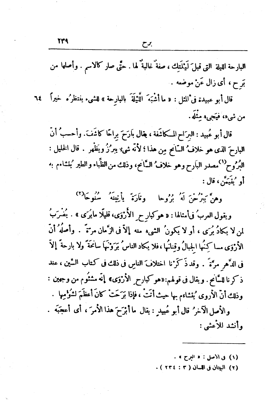 قَالَ أَبُو عُبَيْدٍ: الْبِرَاحُ الْمُكَاشَفَةُ، يُقَالُ: بَارَحَ بِرَاحًا كَاشَفَ. وَأَحْسَبُ أَنَّ الْبَارِحَ الَّذِي هُوَ خِلَافُ السَّانِحِ مِنْ هَذَا; لِأَنَّهُ شَيْءٌ يَبْرُزُ وَيَظْهَرُ. قَالَ الْخَلِيلُ: الْبُرُوحُ مَصْدَرُ الْبَارِحِ وَهُوَ خِلَافُ السَّانِحِ، وَذَلِكَ مِنَ الظِّبَاءِ وَالطَّيْرِ يُتَشَاءَمُ بِهِ أَوْ يُتَيَمَّنُ، قَالَ: