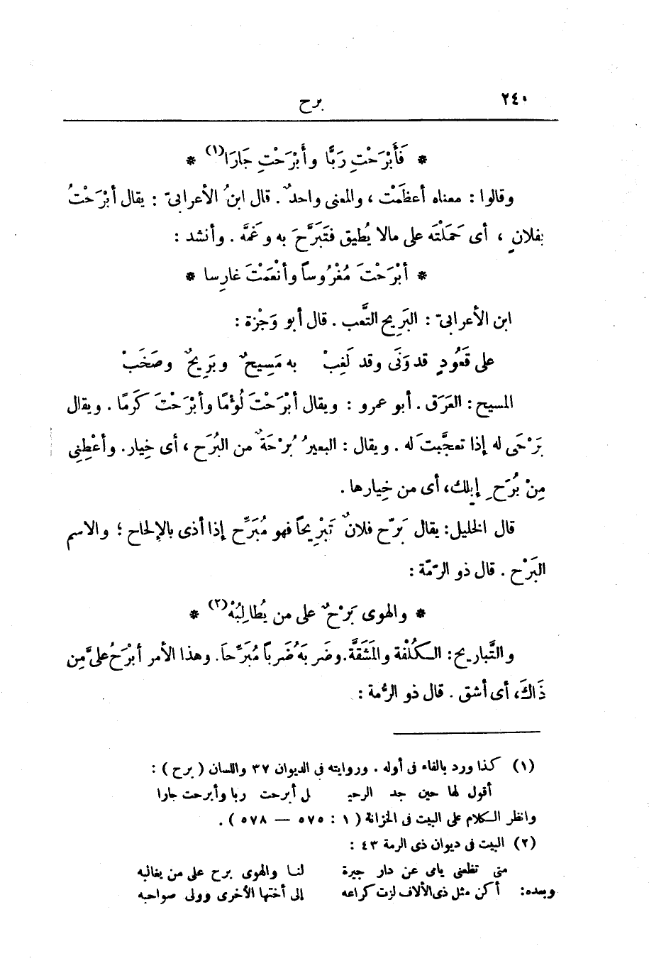 قَالَ الْخَلِيلُ: يُقَالُ: بَرَّحَ فُلَانٌ تَبْرِيحًا فَهُوَ مُبَرِّحٌ: إِذَا أَذَى بِالْإِلْحَاحِ; وَالِاسْمُ الْبَرْحُ. قَالَ ذُو الرُّمَّةِ: