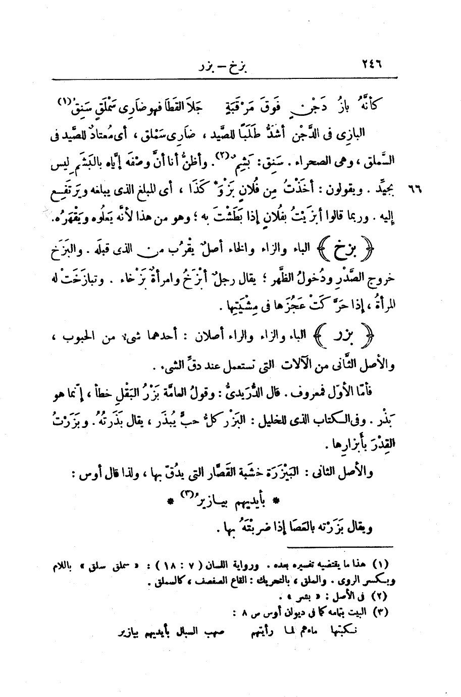 الْبَازِي فِي الدَّجْنِ أَشَدُّ طَلبًا لِلصَّيْدِ، ضَارِي سَمْلَقٌ، أَيْ: مُعْتَادٌ لِلصَّيْدِ فِي السَّمْلَقِ، وَهِيَ الصَّحْرَاءُ. سَنِقٌ: بَشِمٌ. وَأَظُنُّ أَنَا أَنَّ وَصْفَهُ إِيَّاهُ بِالْبَشَمِ لَيْسَ بِجَيِّدٍ. وَيَقُولُونَ: أَخَذْتُ مِنْ فُلَانٍ بَزْوَ كَذَا، أَيِ الْمَبْلَغَ الَّذِي يَبْلُغُهُ وَيَرْتَفِعُ إِلَيْهِ. وَرُبَّمَا قَالُوا أَبْزَيْتُ بِفُلَانٍ: إِذَا بَطَشْتَ بِهِ; وَهُوَ مِنْ هَذَا لِأَنَّهُ يَعْلُوهُ وَيَقْهَرُهُ.