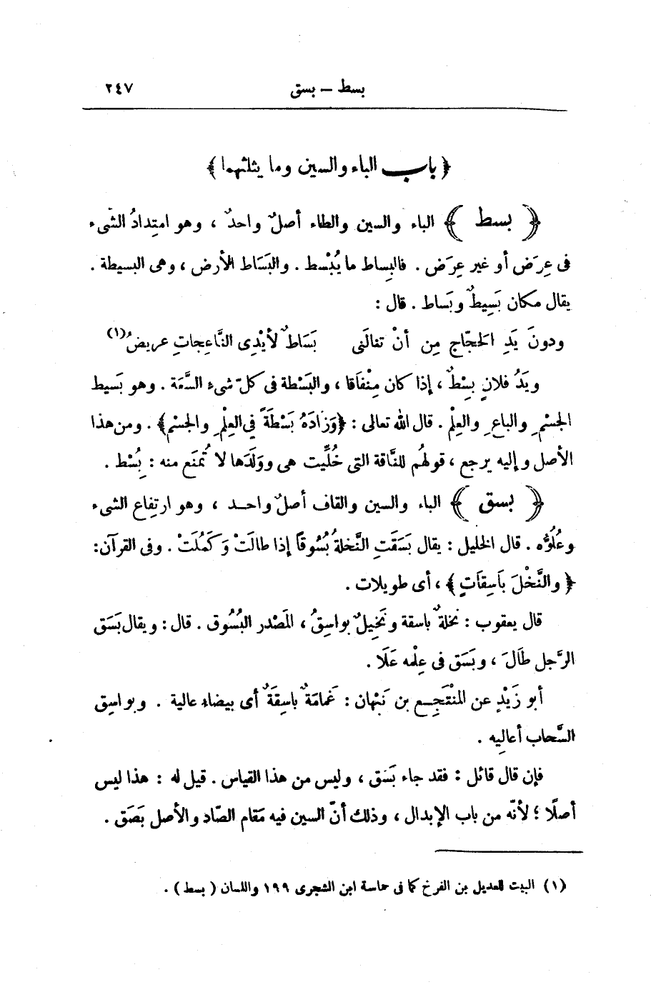 فَإِنْ قَالَ قَائِلٌ: فَقَدْ جَاءَ بَسَقَ، وَلَيْسَ مِنْ هَذَا الْقِيَاسِ. قِيلَ لَهُ: هَذَا لَيْسَ أَصْلًا لِأَنَّهُ مِنْ بَابِ الْإِبْدَالِ، وَذَلِكَ أَنَّ السِّينَ فِيهِ مَقَامُ الصَّادِ وَالْأَصْلُ بَصَقَ.