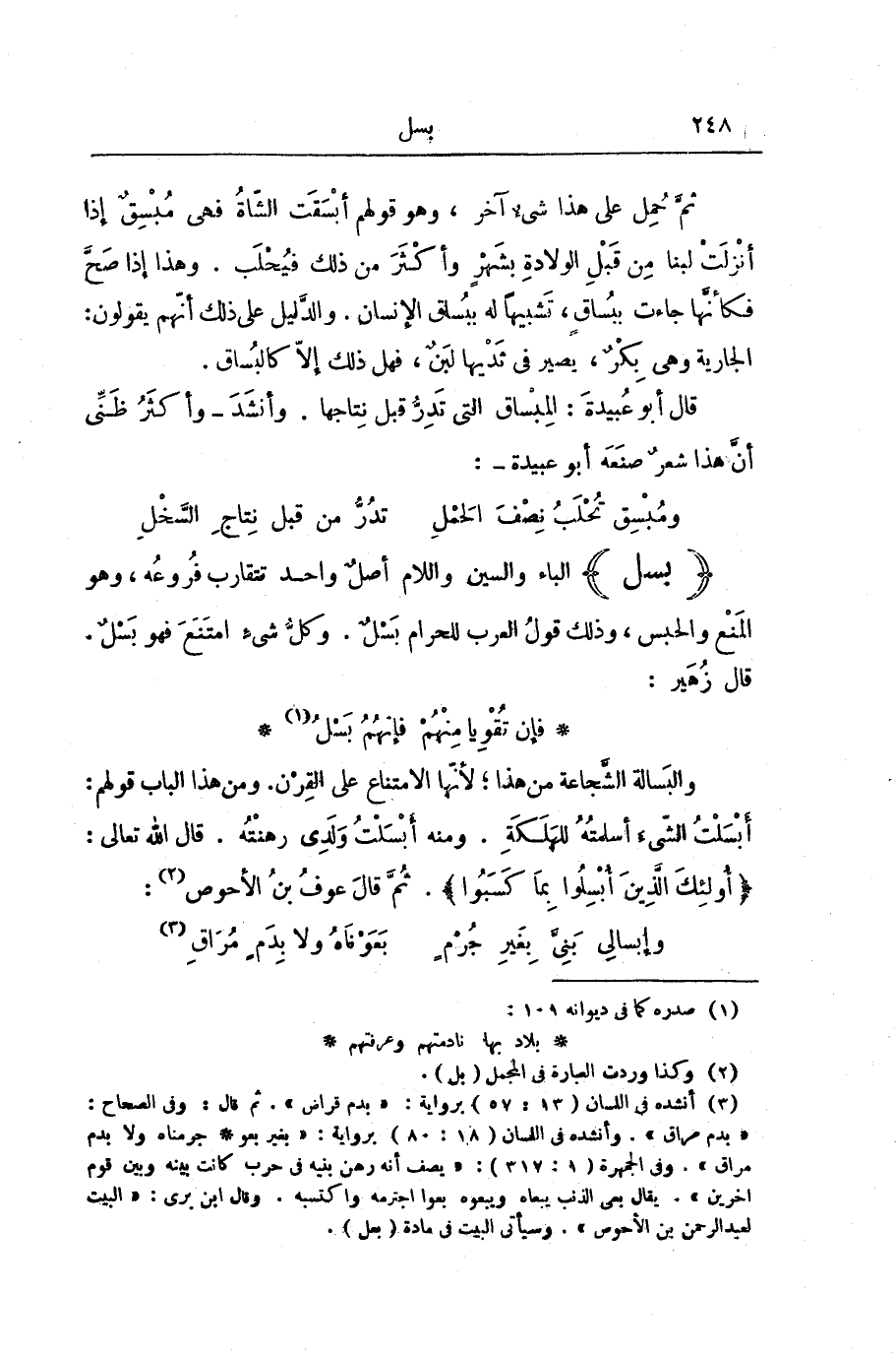 وَالْبَسَالَةُ الشَّجَاعَةُ مِنْ هَذَا; لِأَنَّهَا الِامْتِنَاعُ عَلَى الْقِرْنِ. وَمِنْ هَذَا الْبَابِ قَوْلُهُمْ: أَبْسَلْتُ الشَّيْءَ أَسْلَمْتُهُ لِلْهَلَكَةِ. وَمِنْهُ أَبْسَلْتُ وَلَدِي رَهَنْتُهُ. قَالَ اللَّهُ تَعَالَى: {أُولَئِكَ الَّذِينَ أُبْسِلُوا بِمَا كَسَبُوا} [الأنعام: 70] . ثُمَّ قَالَ عَوْفُ بْنُ الْأَحْوَصِ: