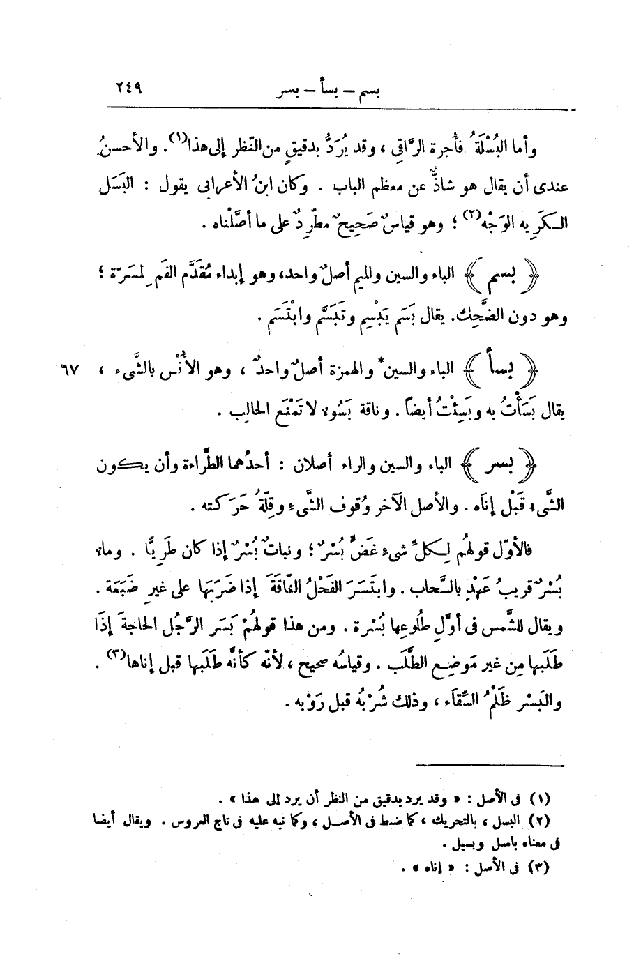 وَأَمَّا الْبُسْلَةُ فَأُجْرَةُ الرَّاقِي، وَقَدْ يُرَدُّ بِدَقِيقٍ مِنَ النَّظَرِ إِلَى هَذَا. وَالْأَحْسَنُ عِنْدِي أَنْ يُقَالَ هُوَ شاذٌ عَنْ مُعْظَمِ الْبَابِ. وَكَانَ ابْنُ الْأَعْرَابِيِّ يَقُولُ: الْبَسَلُ الْكَرِيهُ الْوَجْهِ; وَهُوَ قِيَاسٌ صَحِيحٌ مُطَّرِدٌ عَلَى مَا أَصَّلْنَاهُ.