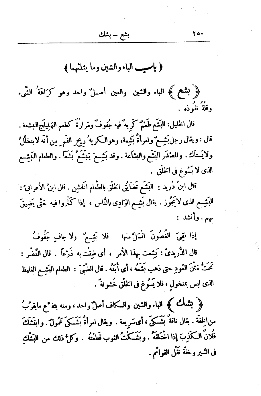 قَالَ ابْنُ دُرَيْدٍ: الْبَشَعُ تَضَايُقُ الْحَلْقِ بِالطَّعَامِ الْخَشِنِ. قَالَ ابْنُ الْأَعْرَابِيِّ: الْبَشِعُ الَّذِي لَا يَجُوزُ. يُقَالُ: بَشِعَ الْوَادِي بِالنَّاسِ: إِذَا كَثُرُوا فِيهِ حَتَّى يَضِيقَ بِهِمْ. وَأَنْشَدَ: