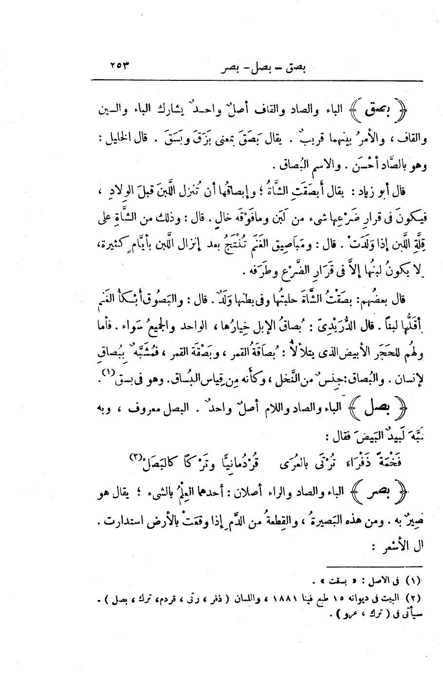 قَالَ أَبُو زِيَادٍ: يُقَالُ: أَبَصَقَتِ الشَّاةُ، وَإِبْصَاقُهَا أَنْ تُنْزِلَ اللَّبَنَ قَبْلَ الْوِلَادِ فَيَكُونَ فِي قَرَارِ ضَرْعِهَا شَيْءٌ مِنْ لَبَنٍ وَمَا فَوْقَهُ خَالٍ. قَالَ: وَذَلِكَ مِنَ الشَّاةِ عَلَى قِلَّةِ اللَّبَنِ إِذَا وَلَدَتْ. قَالَ: وَمَبَاصِيقُ الْغَنَمِ تُنْتَجُ بَعْدَ إِنْزَالِ اللَّبَنِ بِأَيَّامٍ كَثِيرَةٍ، وَلَا يَكُونُ لَبَنُهَا إِلَّا فِي قَرَارِ الضَّرْعِ وَطَرَفِهِ.