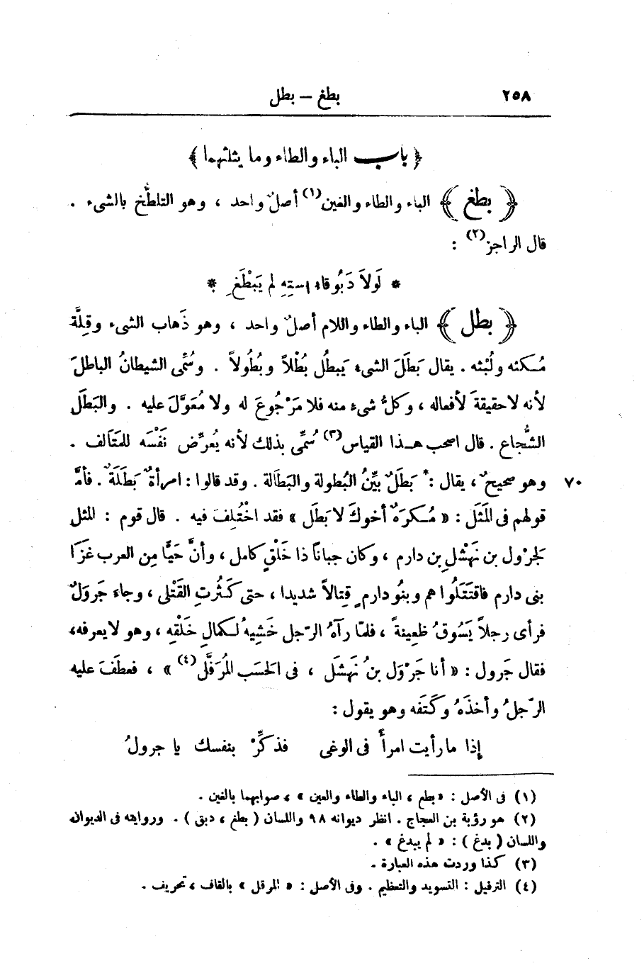(بَطَلَ) الْبَاءُ وَالطَّاءُ وَاللَّامُ أَصْلٌ وَاحِدٌ، وَهُوَ ذَهَابُ الشَّيْءِ وَقِلَّةُ مُكْثِهِ وَلُبْثِهِ. يُقَالُ: بَطَلَ الشَّيْءُ يَبْطُلُ بُطْلًا وَبُطُولًا. وَسُمِّيَ الشَّيْطَانُ الْبَاطِلَ لِأَنَّهُ لَا حَقِيقَةَ لِأَفْعَالِهِ، وَكُلُّ شَيْءٍ مِنْهُ فَلَا مَرْجُوعَ لَهُ وَلَا مُعَوَّلَ عَلَيْهِ. وَالْبَطَلُ الشُّجَاعُ. قَالَ أَصْحَابُ هَذَا الْقِيَاسِ سُمِّيَ بِذَلِكَ لِأَنَّهُ يُعَرِّضُ نَفْسَهُ لِلْمَتَالِفِ. وَهُوَ صَحِيحٌ، يُقَالُ: بَطَلٌ بَيِّنُ الْبُطُولَةِ وَالْبَطَالَةِ. وَقَدْ قَالُوا: امْرَأَةٌ بَطَلَةٌ. فَأَمَّا قَوْلُهُمْ فِي الْمَثَلِ: " مُكْرَهٌ أَخُوكَ لَا بَطَلٌ " فَقَدِ اخْتُلِفَ فِيهِ. قَالَ قَوْمٌ: الْمَثَلُ لِجَرْوَلِ بْنِ نَهْشَلِ بْنِ دَارِمٍ، وَكَانَ جَبَانًا ذَا خَلْقٍ كَامِلٍ، وَأَنَّ حَيًّا مِنَ الْعَرَبِ غَزَا بَنِي دَارِمٍ فَاقْتَتَلُوا هُمْ وَبَنُو دَارِمٍ قِتَالًا شَدِيدًا، حَتَّى كَثُرَتِ الْقَتْلَى، وَجَاءَ جَرْوَلٌ فَرَأَى رَجُلًا يَسُوقُ ظَعِينَةً فَلَمَّا رَآهُ الرَّجُلُ خَشِيَهُ لِكَمَالِ خَلْقِهِ، وَهُوَ لَا يَعْرِفُهُ، فَقَالَ جَرْوَلٌ: " أَنَا جَرْوَلُ بْنُ نَهْشَلِ، فِي الْحَسَبِ الْمُرَفَّلِ "، فَعَطَفَ عَلَيْهِ الرَّجُلُ وَأَخَذَهُ وَكَتَّفَهُ وَهُوَ يَقُولُ: