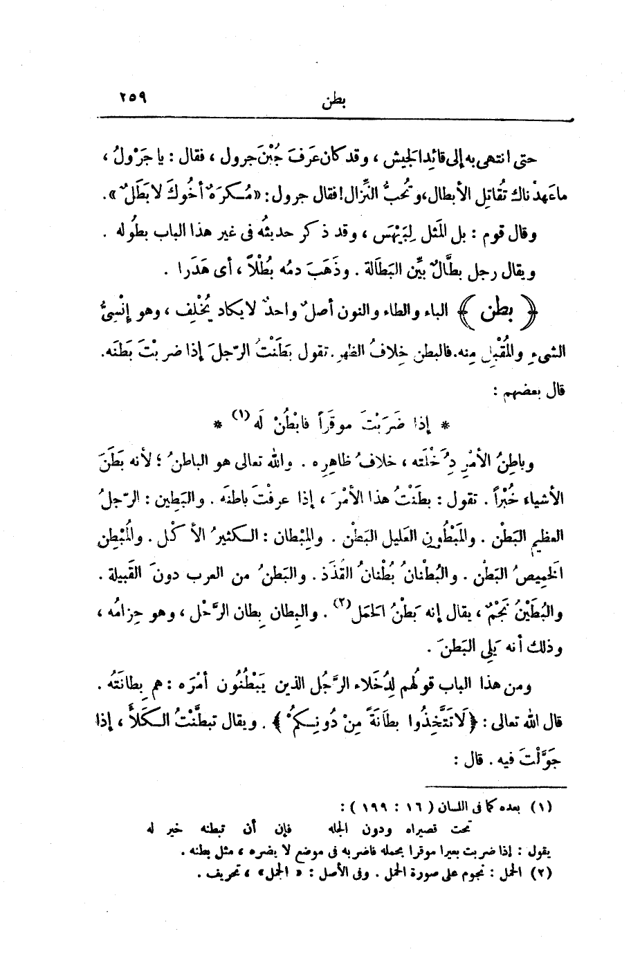 وَبَاطِنُ الْأَمْرِ دَُِخْلَتُهُ، خِلَافُ ظَاهِرِهِ. وَاللَّهُ تَعَالَى هُوَ الْبَاطِنُ; لِأَنَّهُ بَطَنَ الْأَشْيَاءَ خُبْرًا. تَقُولُ: بَطَنْتُ هَذَا الْأَمْرَ: إِذَا عَرَفْتَ بَاطِنَهُ. وَالْبَطِينُ: الرَّجُلُ الْعَظِيمُ الْبَطْنِ. وَالْمَبْطُونُ الْعَلِيلُ الْبَطْنِ. وَالْمِبْطَانُ: الْكَثِيرُ الْأَكْلِ. وَالْمُبْطِنُ الْخَمِيصُ الْبَطْنِ. وَالْبُطْنَانُ بُطْنَانُ الْقُذَذِ. وَالْبَطْنُ مِنَ الْعَرَبِ دُونَ الْقَبِيلَةِ. وَالْبُطَيْنُ نَجْمٌ، يُقَالُ: إِنَّهُ بَطْنُ الْحَمَلِ. وَالْبِطَانُ بِطَانُ الرَّحْلِ، وَهُوَ حِزَامُهُ، وَذَلِكَ أَنَّهُ يَلِي الْبَطْنَ.