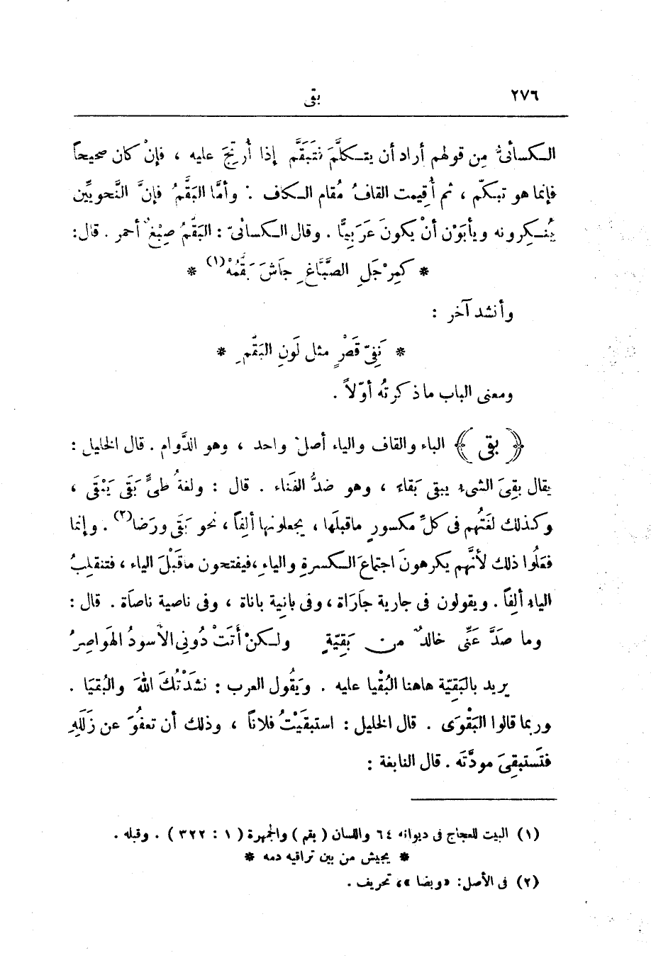 (بَقِيَ) الْبَاءُ وَالْقَافُ وَالْيَاءُ أَصْلٌ وَاحِدٌ، وَهُوَ الدَّوَامُ. قَالَ الْخَلِيلُ: يُقَالُ: بَقِيَ الشَّيْءُ يَبْقَى بَقَاءً، وَهُوَ ضِدُّ الْفَنَاءِ. قَالَ: وَلُغَةُ طَيٍّ بَقَى يَبْقَى، وَكَذَلِكَ لُغَتُهُمْ فِي كُلِّ مَكْسُورٍ مَا قَبْلَهَا، يَجْعَلُونَهَا أَلِفًا، نَحْوَ بَقَى وَرَضَا. وَإِنَّمَا فَعَلُوا ذَلِكَ لِأَنَّهُمْ يَكْرَهُونَ اجْتِمَاعَ الْكَسْرَةِ وَالْيَاءِ، فَيَفْتَحُونَ مَا قَبْلَ الْيَاءِ، فَتَنْقَلِبُ الْيَاءُ أَلِفًا، وَيَقُولُونَ فِي جَارِيَةٍ جَارَاةً، وَفِي بَانِيَةٍ بَانَاةً، وَفِي نَاصِيَةٍ نَاصَاةً. قَالَ: