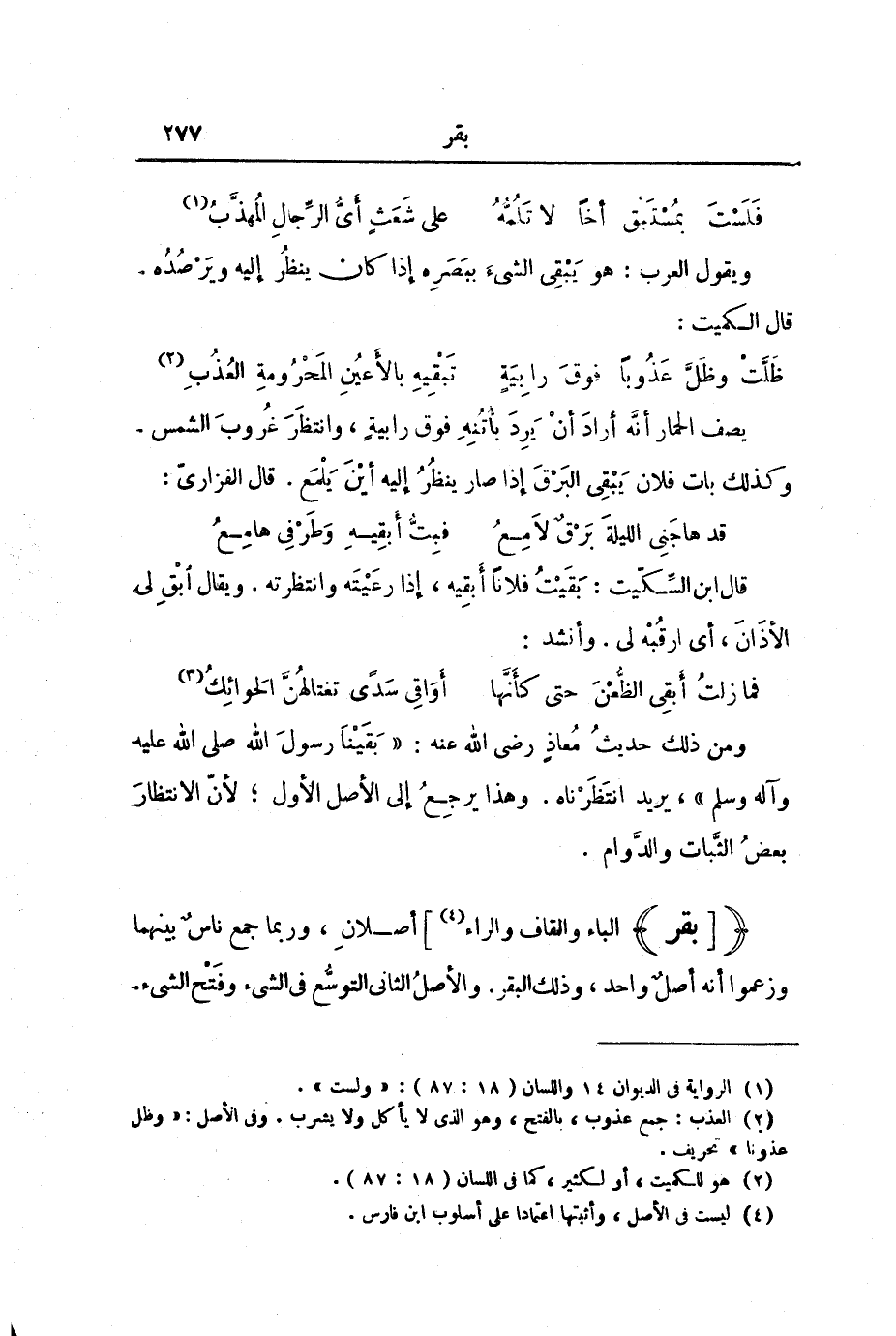 وَمِنْ ذَلِكَ حَدِيثُ مُعَاذٍ رَضِيَ اللَّهُ عَنْهُ: «بَقَيْنَا رَسُولَ اللَّهِ صَلَّى اللَّهُ عَلَيْهِ وَآلِهِ وَسَلَّمَ» ، يُرِيدُ انْتَظَرْنَاهُ. وَهَذَا يَرْجِعُ إِلَى الْأَصْلِ الْأَوَّلِ; لِأَنَّ الِانْتِظَارَ بَعْضُ الثَّبَاتِ وَالدَّوَامِ.