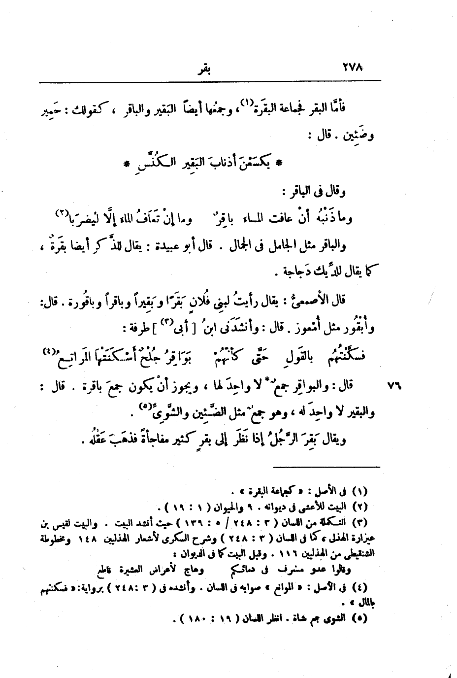 قَالَ: وَالْبَوَاقِرُ جَمْعٌ لَا وَاحِدَ لَهَا، وَيَجُوزُ أَنْ يَكُونَ جَمْعَ بَاقِرَةٍ. قَالَ: وَالْبَقِيرُ لَا وَاحِدَ لَهُ، وَهُوَ جَمْعٌ مِثْلُ الضَّئِينِ وَالشَّوِيِّ.