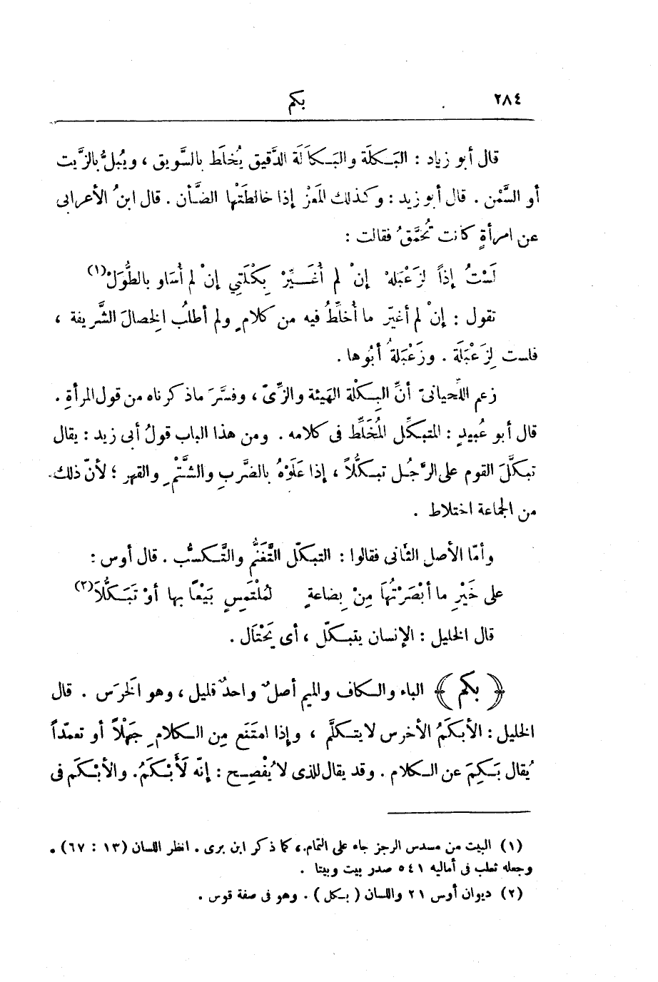 زَعَمَ اللِّحْيَانَيُّ أَنَّ الْبِكْلَةَ الْهَيْئَةُ وَالزِّيُّ، وَفَسَّرَ مَا ذَكَرْنَاهُ مِنْ قَوْلِ الْمَرْأَةِ. قَالَ أَبُو عُبَيْدٍ: الْمُتَبَكِّلُ الْمُخَلِّطُ فِي كَلَامِهِ. وَمِنْ هَذَا الْبَابِ قَوْلُ أَبِي زَيْدٍ: يُقَالُ تَبَكَّلَ الْقَوْمُ عَلَى الرَّجُلِ تَبَكُّلًا، إِذَا عَلَوْهُ بِالضَّرْبِ وَالشَّتْمِ وَالْقَهْرِ ; لِأَنَّ ذَلِكَ مِنَ الْجَمَاعَةِ اخْتِلَاطٌ.