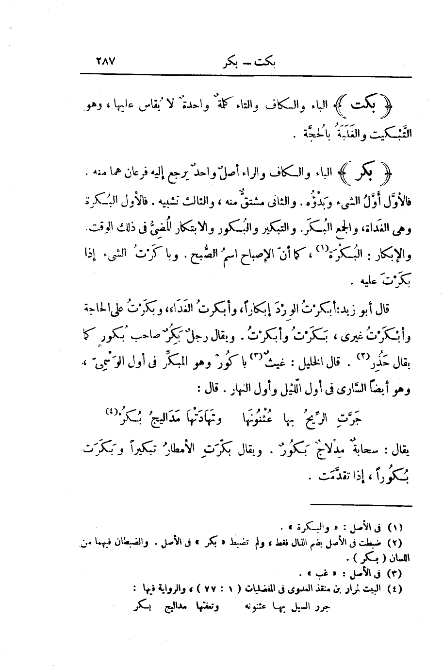 (بَكَرَ) الْبَاءُ وَالْكَافُ وَالرَّاءُ أَصْلٌ وَاحِدٌ يَرْجِعُ إِلَيْهِ فَرْعَانِ هُمَا مِنْهُ. فَالْأَوَّلُ أَوَّلُ الشَّيْءِ وَبَدْؤُهُ. وَالثَّانِي مُشْتَقٌّ مِنْهُ، وَالثَّالِثُ تَشْبِيهٌ. فَالْأَوَّلُ الْبُكْرَةُ وَهِيَ الْغَدَاةُ، وَالْجَمْعُ الْبُكَرُ. وَالتَّبْكِيرُ وَالْبُكُورُ وَالِابْتِكَارُ الْمُضِيُّ فِي ذَلِكَ الْوَقْتِ. وَالْإِبْكَارُ: الْبُكْرَةُ، كَمَا أَنَّ الْإِصْبَاحَ اسْمُ الصُّبْحِ. وَبَاكَرْتُ الشَّيْءَ إِذَا بَكَرْتَ عَلَيْهِ.