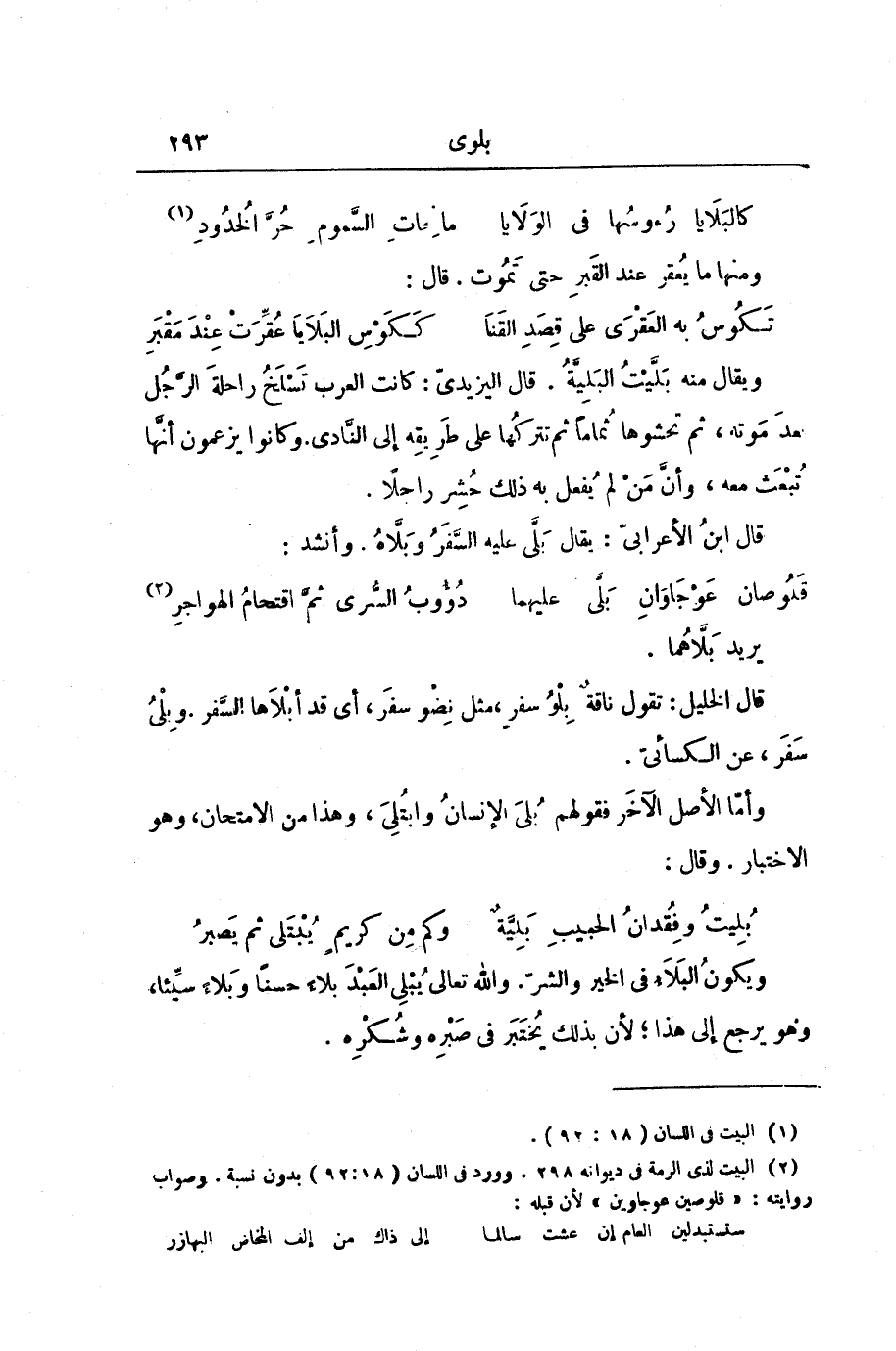 وَيُقَالُ مِنْهُ بَلَّيْتُ الْبَلِيَّةَ. قَالَ الْيَزِيدِيُّ: كَانَتِ الْعَرَبُ تَسْلَخُ رَاحِلَةَ الرَّجُلِ بَعْدَ مَوْتِهِ، ثُمَّ تَحْشُوهَا ثُمَامًا ثُمَّ تَتْرُكُهَا عَلَى طَرِيقِهِ إِلَى النَّادِي. وَكَانُوا يَزْعُمُونَ أَنَّهَا تُبْعَثُ مَعَهُ، وَأَنَّ مَنْ لَمْ يُفْعَلْ بِهِ ذَلِكَ حُشِرَ رَاجِلًا.