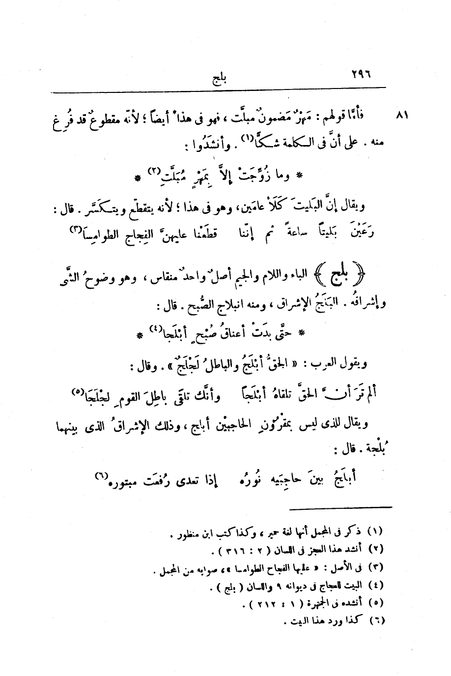 (بَلَجَ) الْبَاءُ وَاللَّامُ وَالْجِيمُ أَصْلٌ وَاحِدٌ مُنْقَاسٌ، وَهُوَ وُضُوحُ الشَّيْءِ وَإِشْرَاقُهُ. الْبَلَجُ الْإِشْرَاقُ، وَمِنْهُ انْبِلَاجُ الصُّبْحِ. قَالَ: