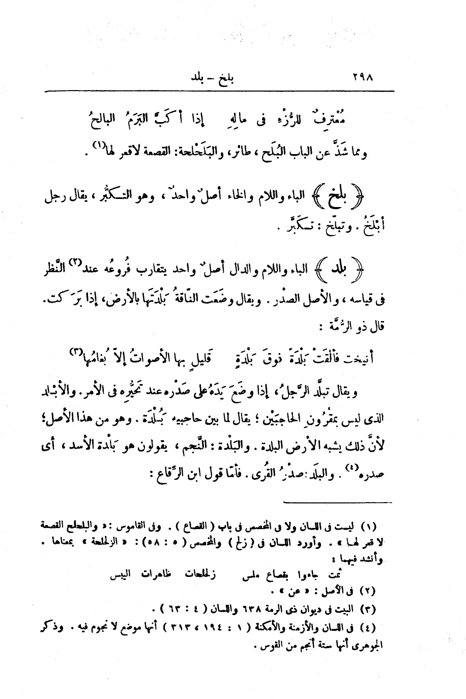وَيُقَالُ تَبَلَّدَ الرَّجُلُ، إِذَا وَضَعَ يَدَهُ عَلَى صَدْرِهِ عِنْدَ تَحَيُّرِهِ فِي الْأَمْرِ. وَالْأَبْلَدُ الَّذِي لَيْسَ بِمَقْرُونِ الْحَاجِبَيْنِ، يُقَالُ لِمَا بَيْنَ حَاجِبَيْهِ بَُلْدَةٌ. وَهُوَ مِنْ هَذَا الْأَصْلِ ; لِأَنَّ ذَلِكَ يُشْبِهُ الْأَرْضَ الْبَلْدَةَ. وَالْبَلْدَةُ: النَّجْمُ، يَقُولُونَ هُوَ بَلْدَةُ الْأَسَدِ، أَيْ صَدْرُهُ. وَالْبَلَدُ صَدْرُ الْقُرَى. فَأَمَّا قَوْلُ ابْنِ الرِّقَاعِ: