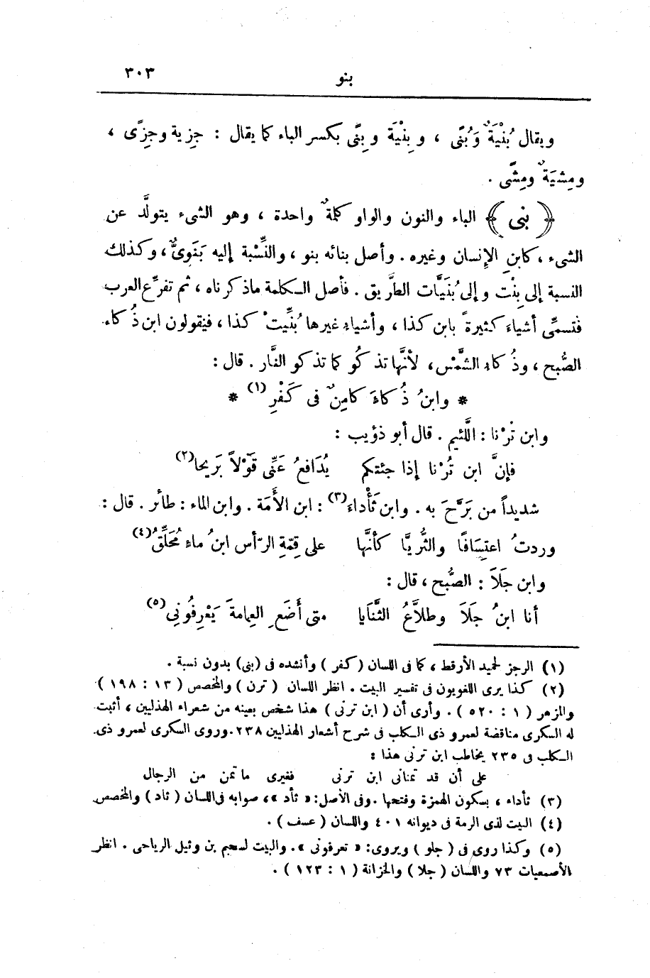 (بَنَوَ) الْبَاءُ وَالنُّونُ وَالْوَاوُ كَلِمَةٌ وَاحِدَةٌ، وَهُوَ الشَّيْءُ يَتَوَلَّدُ عَنِ الشَّيْءِ، كَابْنِ الْإِنْسَانِ وَغَيْرِهِ. وَأَصْلُ بِنَائِهِ بَنَوَ، وَالنِّسْبَةُ إِلَيْهِ بَنَوِيٌّ، وَكَذَلِكَ النِّسْبَةِ إِلَى بِنْتٍ وَإِلَى بُنَيَّاتِ الطَّرِيقِ. فَأَصْلُ الْكَلِمَةِ مَا ذَكَرْنَاهُ، ثُمَّ تُفَرِّعُ الْعَرَبُ. فَتُسَمِّي أَشْيَاءَ كَثِيرَةً بِابْنِ كَذَا، وَأَشْيَاءَ غَيْرِهَا بُنِّيَتْ كَذَا، فَيَقُولُونَ ابْنُ ذُكَاءِ الصُّبْحِ، وَذُكَاءُ الشَّمْسِ، لِأَنَّهَا تَذْكُو كَمَا تَذْكُو النَّارُ. قَالَ: